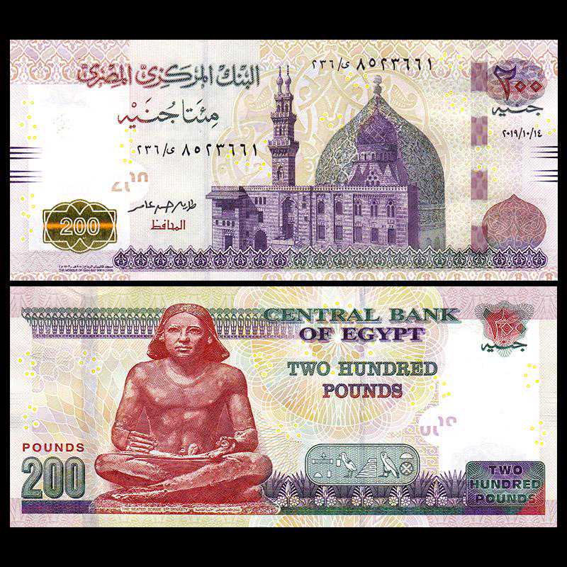 埃及货币称为“埃及镑”,正背面体现的均为清真寺和古代文明,其最大面值200镑约合73元人民币。200镑正面图案主体为埃及的QanybayEl-Rammah清真寺,背面则是《书记官卡伊像》。