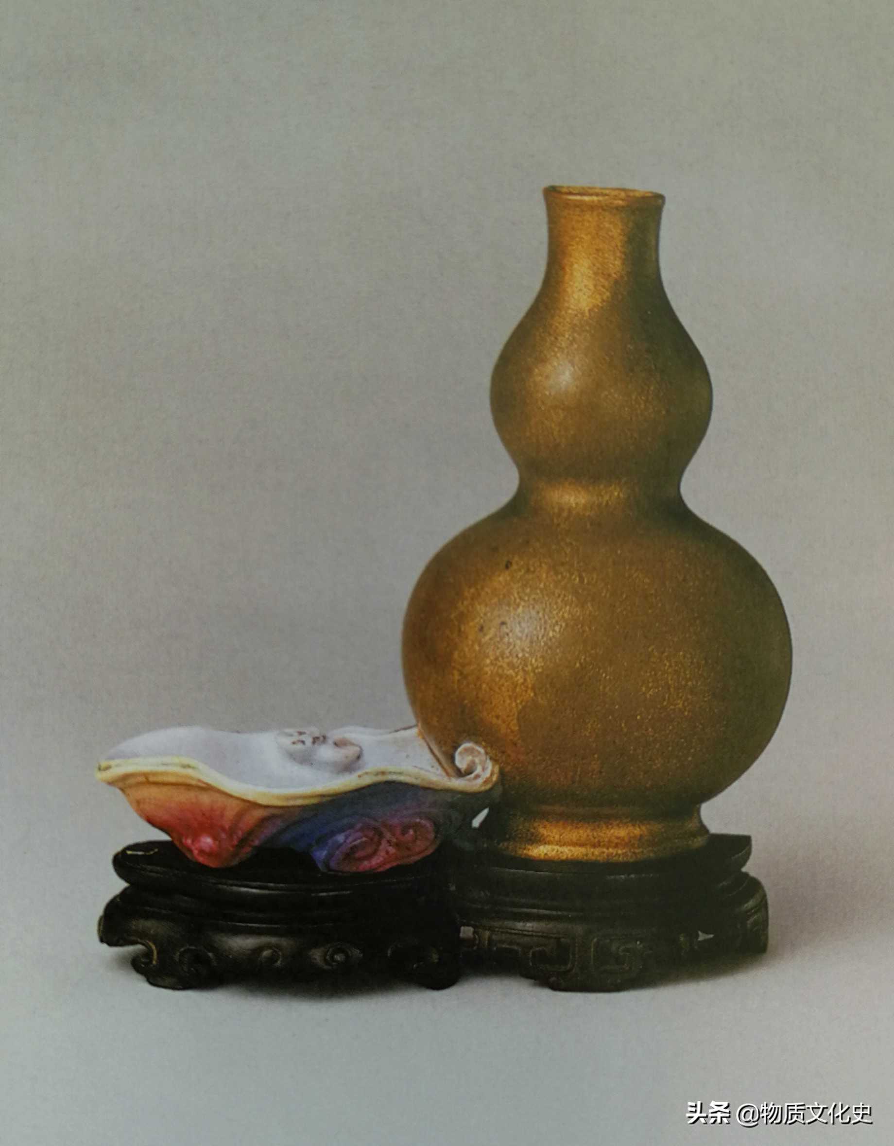 厂官釉描金花卉纹葫芦式壁瓶,清乾隆时期所制,高14.7厘米,清宫旧藏。壁瓶的造型犹如一个半剖的葫芦瓶,底部相连半剖的灵芝状小碗,下以仿紫檀木托座承托,仿生效果逼真。以厂官釉装饰的葫芦瓶上有描金花卉纹,金彩多已脱落。灵芝状小碗以粉彩装饰,无款。厂官釉瓷器中壁瓶较为少见,此壁瓶又以描金装饰,越显珍贵。