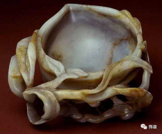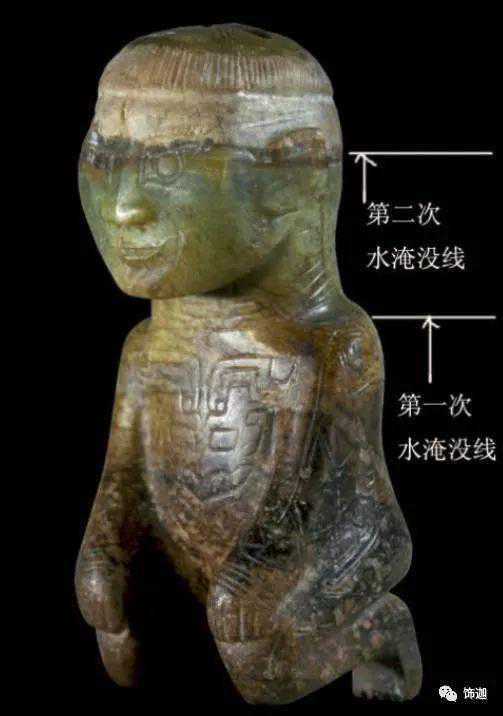 水沁和土沁一样是造成各种沁色的原因。水沁有两种情形,一种是局部水沁,一个是全部被水淹没,即整体受沁。水沁造成的玉面变化比土沁要小。因为如果是满水淹没,反而造成了玉器与空气的隔绝,和与其他物质的隔离,而水中存在的各种化学物质、有机物质浓度相对比较低,所以对玉器造成的侵蚀也出现不同的情形。从实物观察来看,有些水沁仅在局部留下痕迹,且比较淡。而凡是没有完全淹没的玉器,可以看到其受沁部位应该有一条等高线。水沁还会在玉器的裂隙形成绺璺沁。
