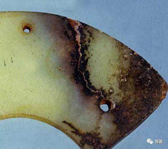 下面这块玉器可见底下一层受地表水沁变色。