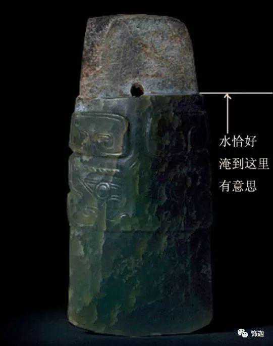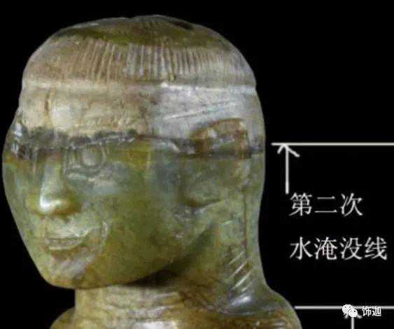 下面这块玉先形成了一条水沁线,以后尾部下沉,所以尾部和头部等高线发生变化。