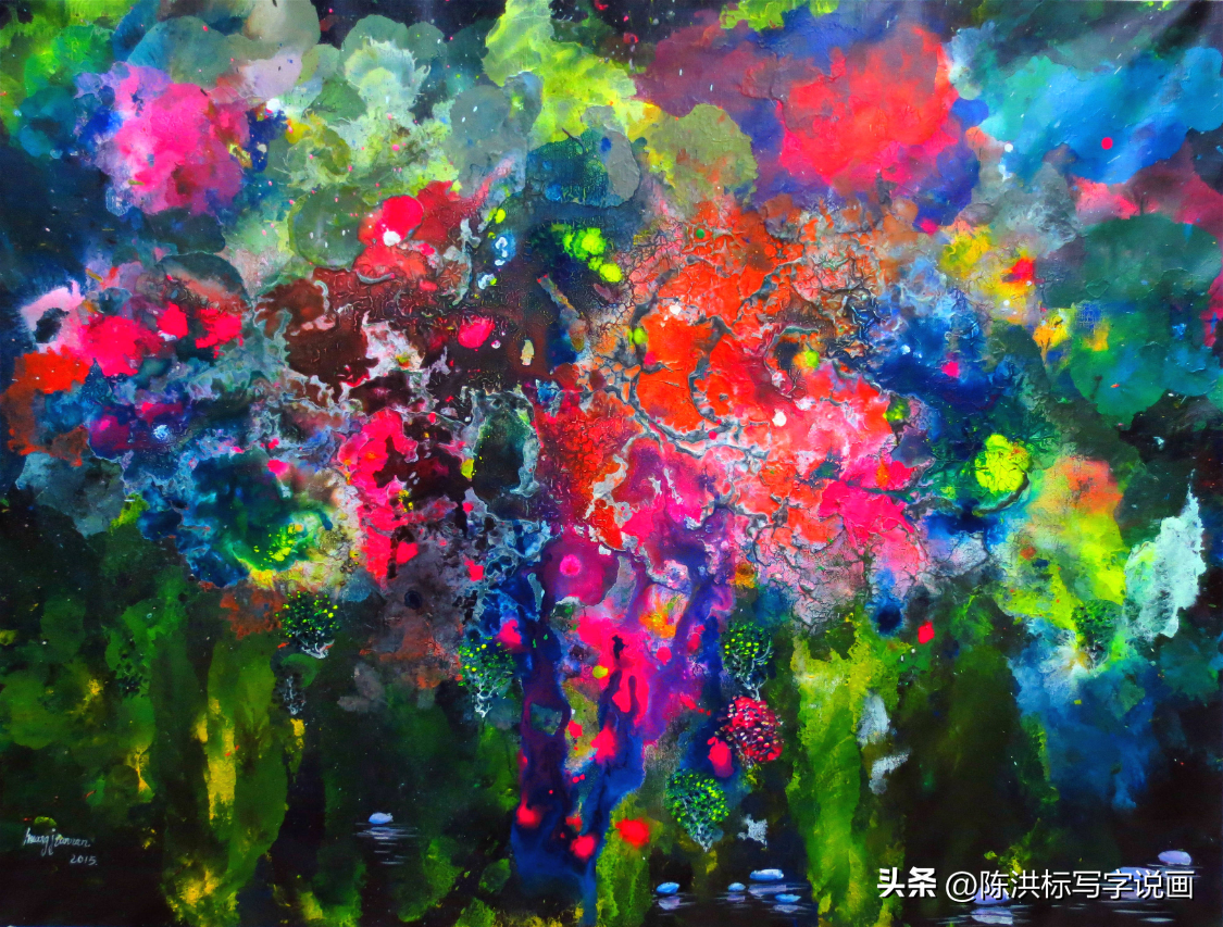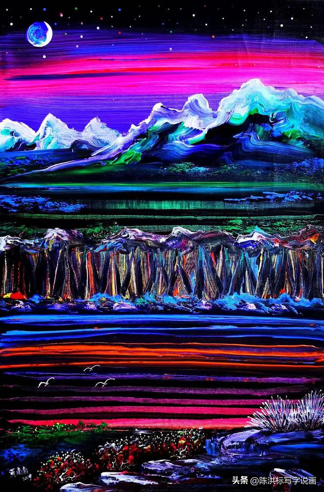 因为他在追求淡雅意境的传统中国水墨画中,加入了朝阳般火热的色彩,画面色感温暖,颜色斑斓,线条和用色都极为大胆。