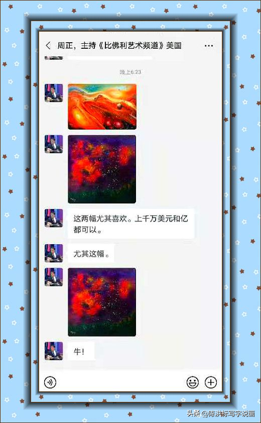 Degnan从周正那里看到了更多黄建南画作的图片,他特别喜欢其中的两幅,并开出了天价:一幅油画《起源》1千万美金,另一幅油画《红红火火》1亿美金。