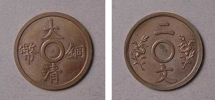 在大清铜币的遗存中,有珍有普,普品居多,然亦有十大珍、十小珍,诸如此类。而在所谓十小珍中,有一枚甚独特的大清铜币,即为“大清铜币双花二文”。此币为清末宣统年所铸的套币之一(一文、二文、五文、十文),而其最为独特之处在于其未铸满文,并在满文位置即币面左右采用了花卉纹,这在大清铜币中是独一无二的。根据记载,该套币除了十文有流通外,其余皆未发行流通,故该币仅为试铸,铸量很少,遗存稀薄,终成收藏珍品。
