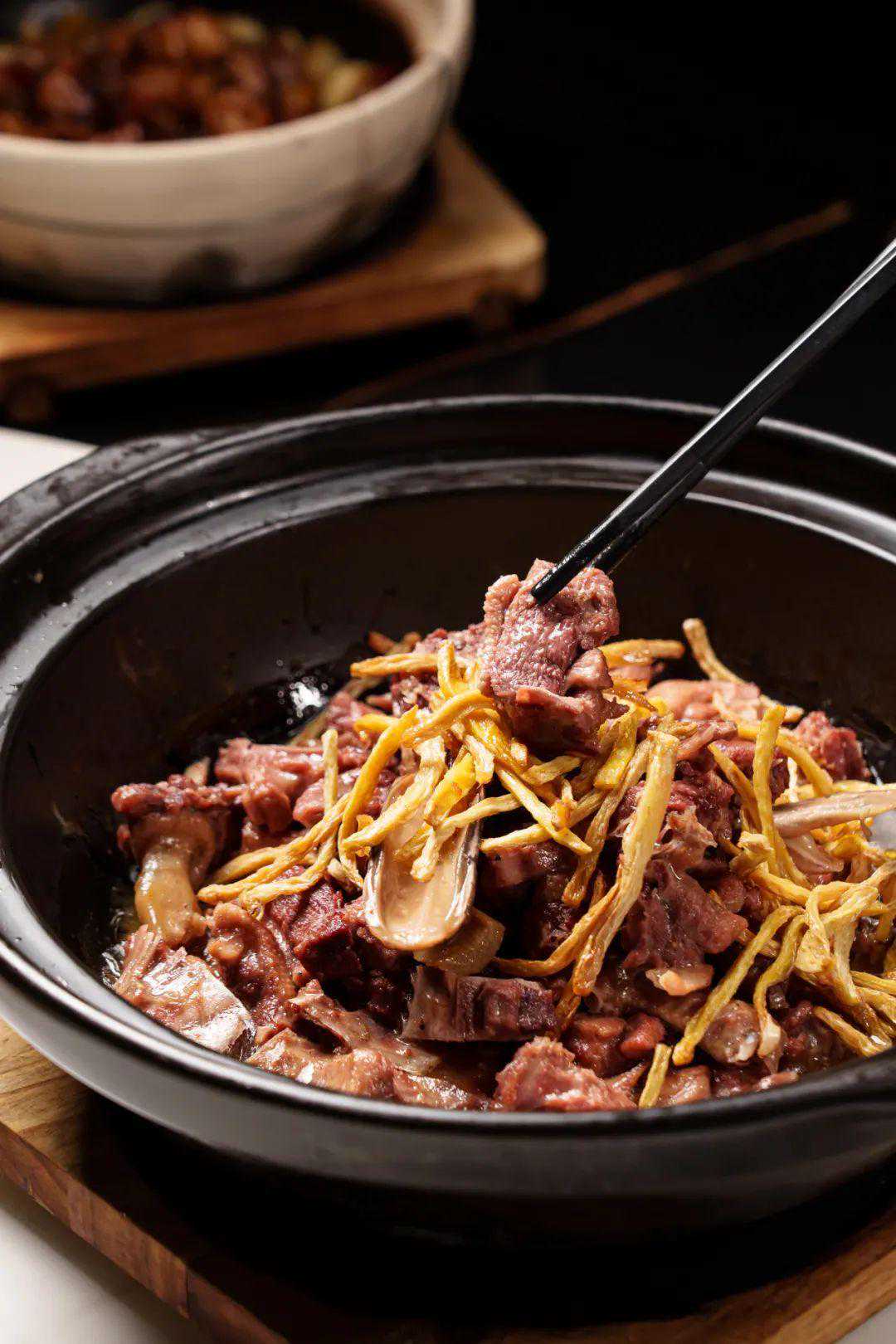 整煲上桌,份量很霸气,香气不断散发,谁能忍住不动筷呀!趁热吃,鸭肉紧实又细嫩,肉汁在口中横流,与姜的独特香气层层交织,姜香肉嫩,味入骨髓,一个绝字了得!