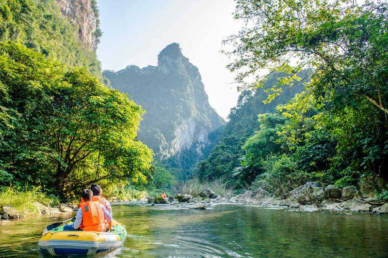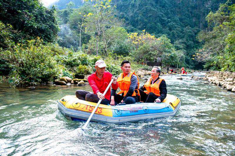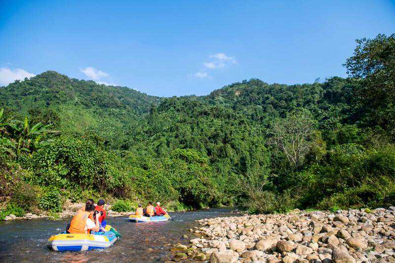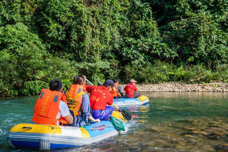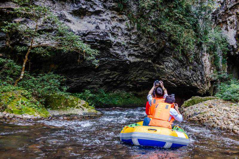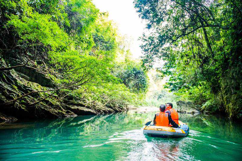整个峡谷长度约有6.8公里左右,途中会经过三个溶洞,搭乘橡皮艇是游览古龙山大峡谷,欣赏两岸景色的最佳方式。橡皮艇为2人一艘,整个漂流过程在夏季是1个小时左右,而冬季差不多约为2个小时左右。一路上空气都十分清新,而且因为这里并无其他交通工具可以使用的原因,所以景色这么多年也毫无污染,到现在都很清幽,橡皮艇会随着水流或缓或急的行驶着,两岸景色入眼皆是一片绿海密林,满满的负离子充盈着整个峡谷,全然一幅原生态画卷的模样。