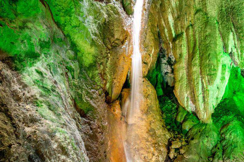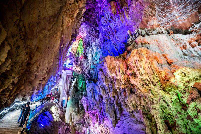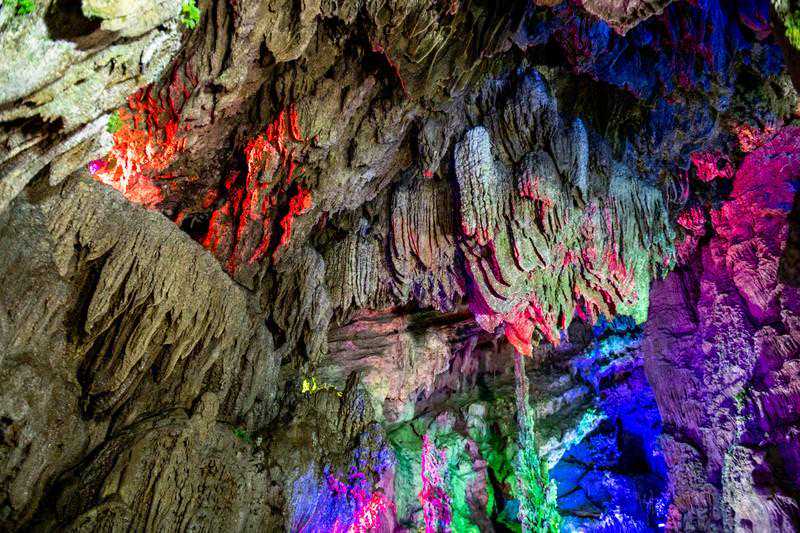 除了各具特色的“三峡”,在古龙山大峡谷内,最让人觉得神秘的要属那峡与峡之间相通相连的三个天然溶洞。从迎宾洞,到百福洞,再到水帘洞,跟着橡皮艇仿佛像是在一场奇异的洞中探险,让人大开眼界。溶洞内暗河流动,深不见底,加上环境幽暗更显神秘,坐在橡皮船上不由得谨慎了几分。四周和洞顶皆是成串成串的钟乳石,千姿百态,有的似动物,有的似人,在彩色灯光的照耀下,更加栩栩如生,活灵活现,让人忍不住细细揣摩,根本离不开眼。