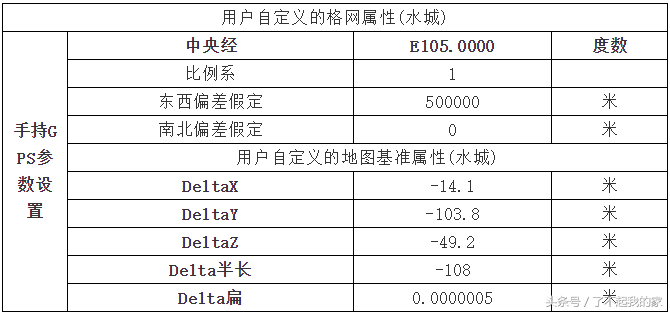 将计算出的DX、DY、DZ三个参数与DA、DF、中央经线、投影比例、东西偏差、南北偏差等六个常数值输入GPS接收机。将GPS接收机的网格转换为“UserGrid”格式,实际测量已知点的公里网纵、横坐标值,并与对应的公里网纵、横坐标已知值进行比较,二者相差较大时要重新计算或查找出现问题的原因。详细过程可查看《万能坐标转换》软件的【手持GPS参数设置】界面。
