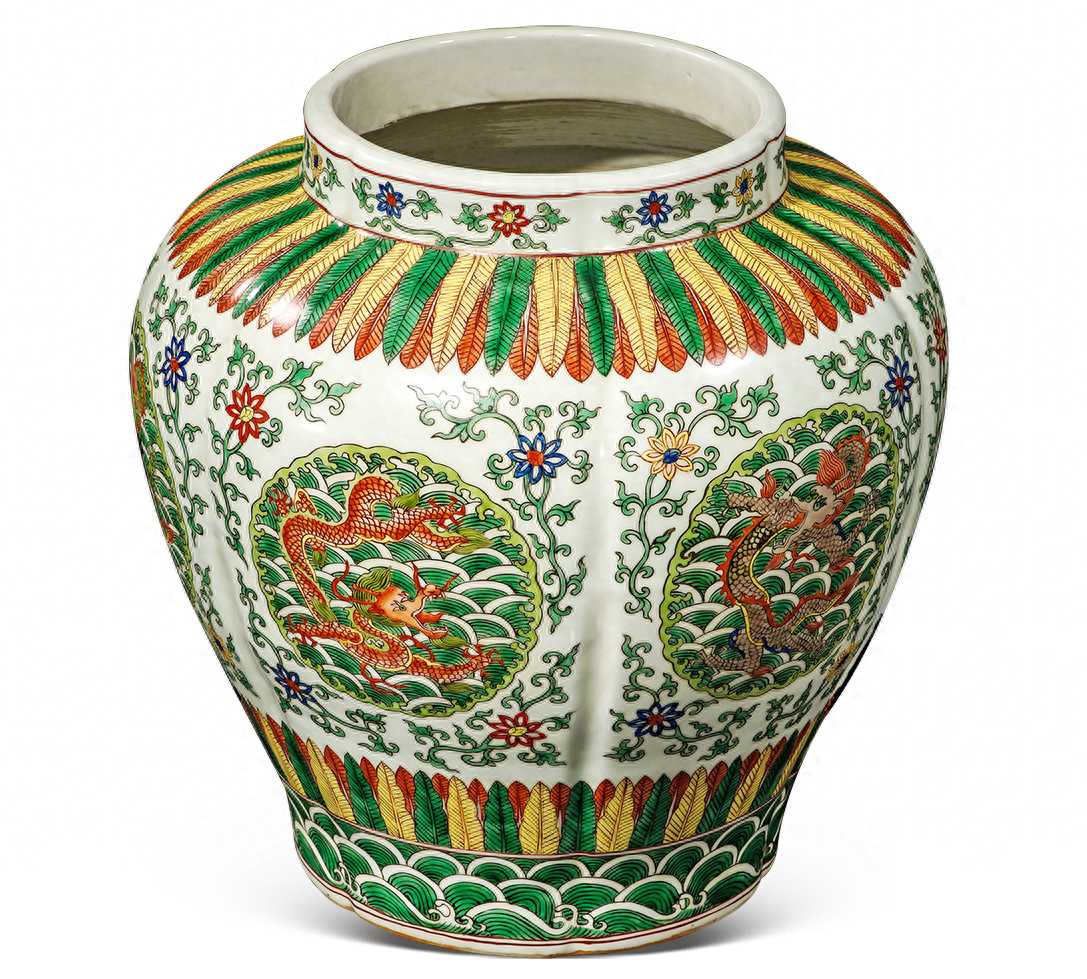 此物器形伟岸,腹部六瓣瓜棱形,外壁以五彩为饰,颈部饰折枝莲纹,腹部以棱瓣为界,绘六组圆形开光海水龙纹,外以折枝莲纹缠绕,上下各饰蕉叶纹一周,胫部近足端则饰海浪纹,纹饰布局繁密,釉彩搭配鲜艳,其中孔雀绿釉为嘉靖时期五彩的特点,时代特征明显。
