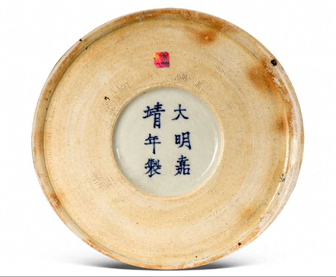 如嘉靖五彩团龙大罐(故宫博物院、上海博物馆、荷兰海牙市博物馆、法国巴黎吉美博物馆均有收藏)就属于这类五彩器,其足底部有一圈露胎,中间施釉如脐形,并有款识写于脐内。”品相完好,极为难得。