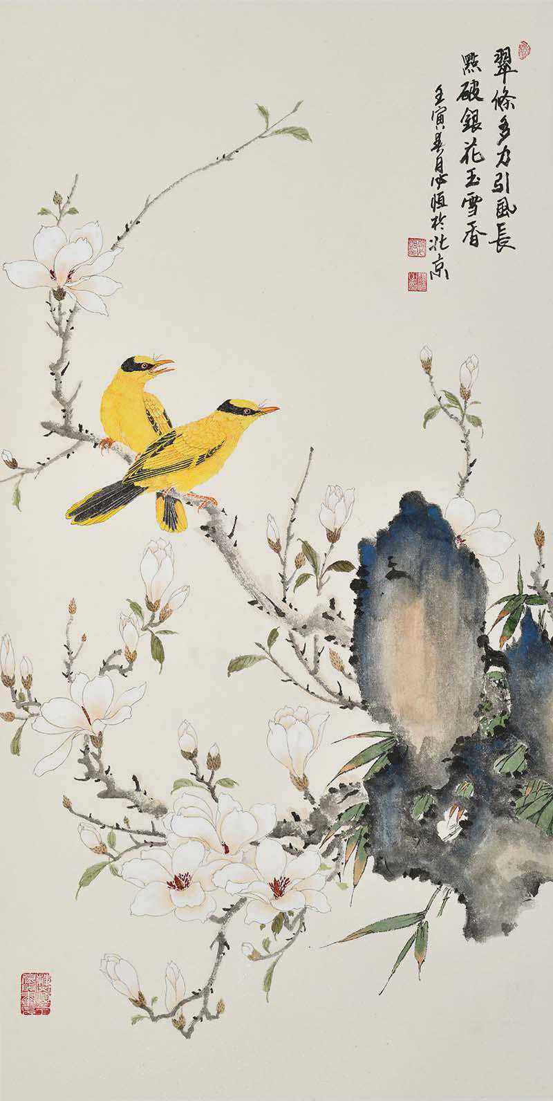 韩必恒的绘画作品以花鸟孔雀为主题。与其他画家不同,他的作品并不是对自然之美的简单再现,而是通过独特的艺术手法,将自然之美与人文情感相结合,传达出深刻的精神内涵。