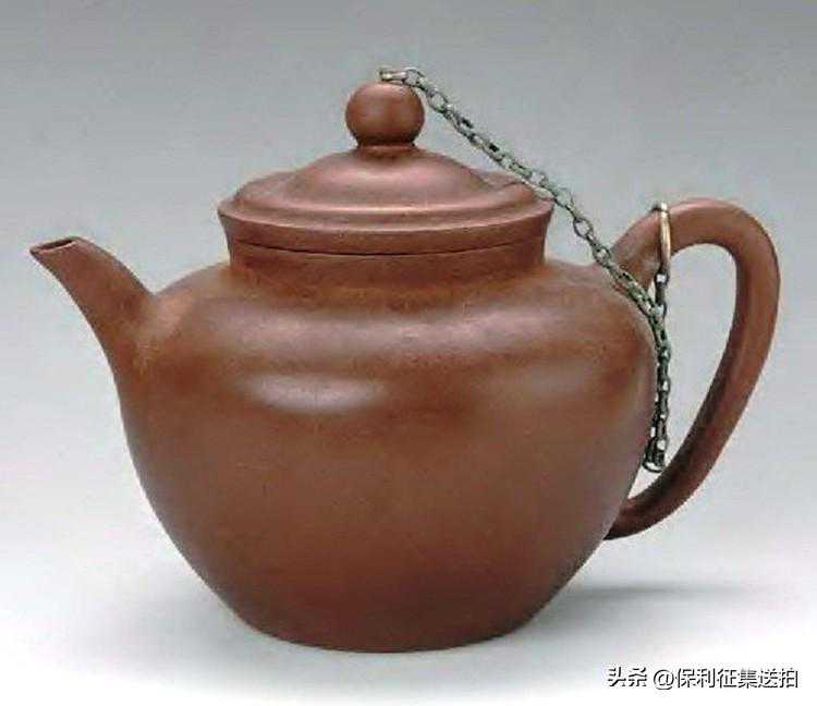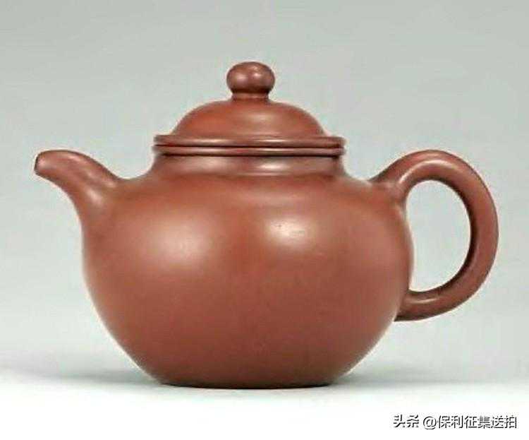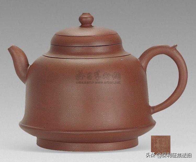 -此壶为清中期制壶泰斗邵大亨所制。泥色呈紫褐,砂质纯正,型制饱满,气韵温雅,珠圆玉润。该壶属於古莲子壶式,或俗称掇球壶。壶体圆腹略高,一弯流曲弧,执把圆弧有力,功法严谨。一亮点是加彩装饰,一侧蝴蝶彩瓜,一侧莲子花卉。紫砂茗壶的釉彩装饰历来倍受清宫廷珍爱,此壶面施蓝釉花卉图案,技法高超,属上乘之作,应为清皇室匠师所为的宫廷紫砂器。