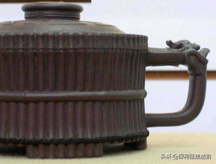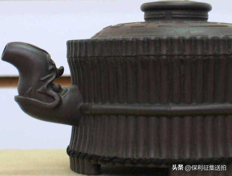 壶身外壁似一捆整齐的竹段,中腰以一竹束之。竹段顶端(即壶面边沿)逐个雕刻小圆圈,以示竹心中空,形象逼真。壶盖以的为中心雕八卦纹,把、流堆雕龙头。壶底三足,亦雕刻矮竹段编连状,底面雕星象纹。壶色泽蟹青,造型典雅,装饰协调,堪称上品。