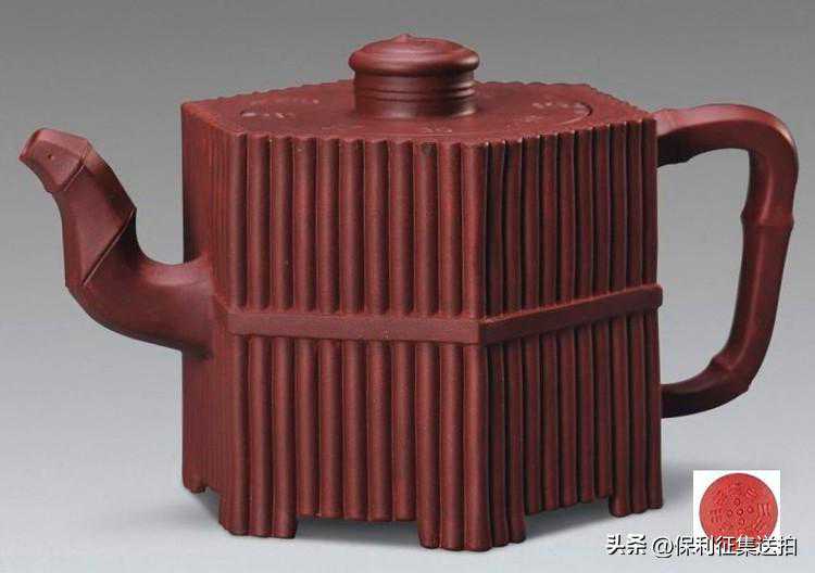 砂质深紫,壶式取法大亨八卦龙头束竹壶,唯改去壶流与壶把的龙首造型,改以竹节代之,并作六方形,视觉上更浑然一体。此壶盖上饰以印花的伏羲八卦方位图,盖钮以太极居中,壶身用60根细竹束成,加上壶流、壶把、壶钮及壶身束带共64根竹子,象征《易经》中的64卦。每根段竹大致均匀,制作虽然看似随意,然而率性中工整严谨。六只扁足分别由腹中延伸出,每五根成组,壶底仿造古代易学文献压制成河图与洛书,制作颇费心力。