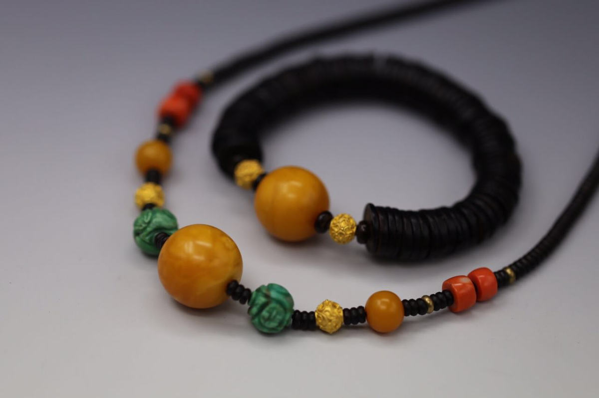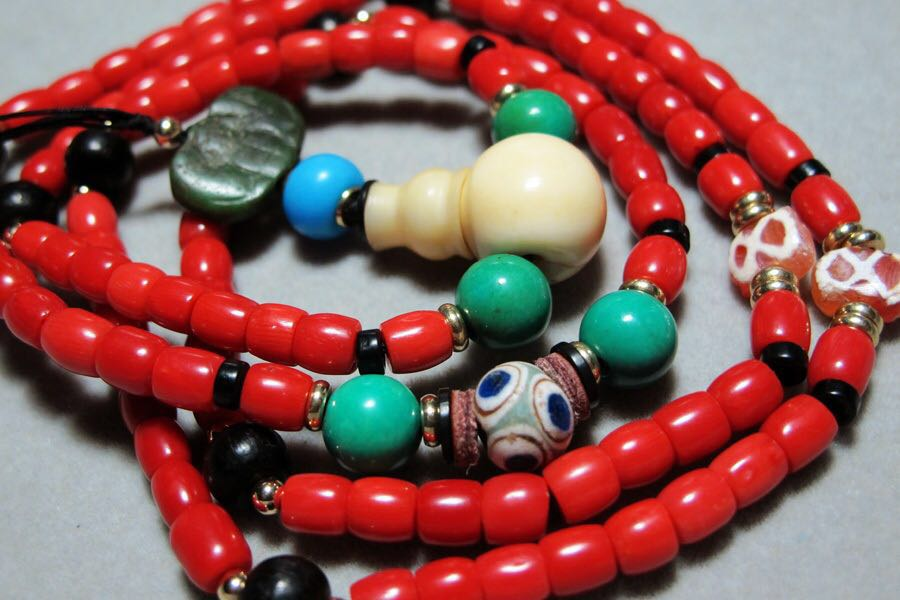 牧之热衷古珠收藏,聊起来也是如数家珍:羽状纹珠,在制作琉璃珠时将另其他色条缠绕在珠体上,之后用针类工具纵向来回划出,类似羽毛的纹样。