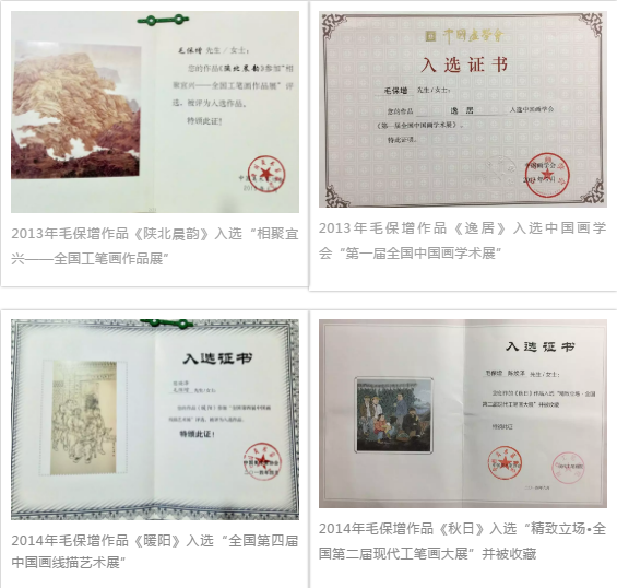 毛保增的艺术作品屡次入选多个中国美协主办的国家大展如:2008年《中国美协国画年展及全国抗震救灾中国画捐助展》、2012年《中国美协中国画年展》并荣获优秀奖、2013年《全国首届中国画学术展》、2014年第二届全国现代工笔画展及第四届全国线描艺术大展等。