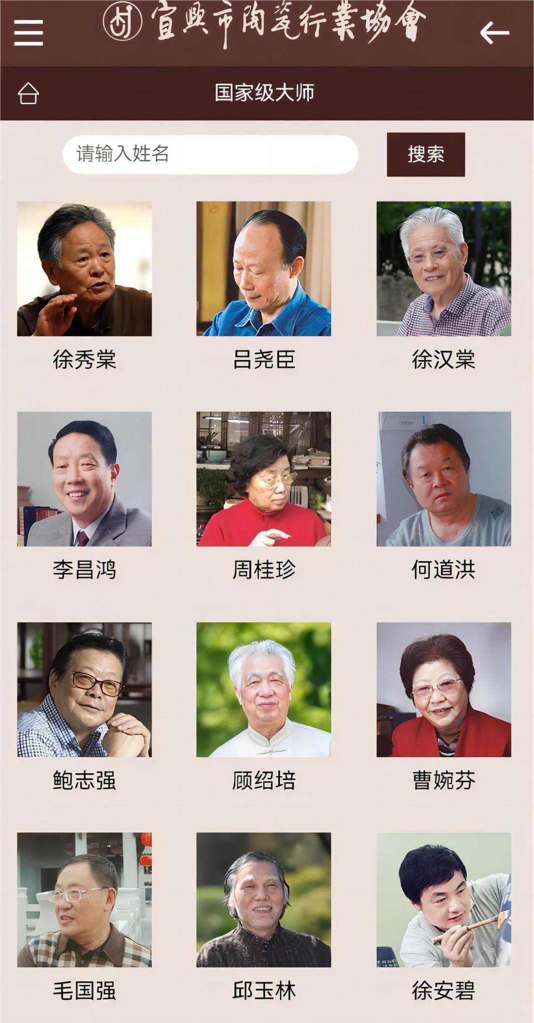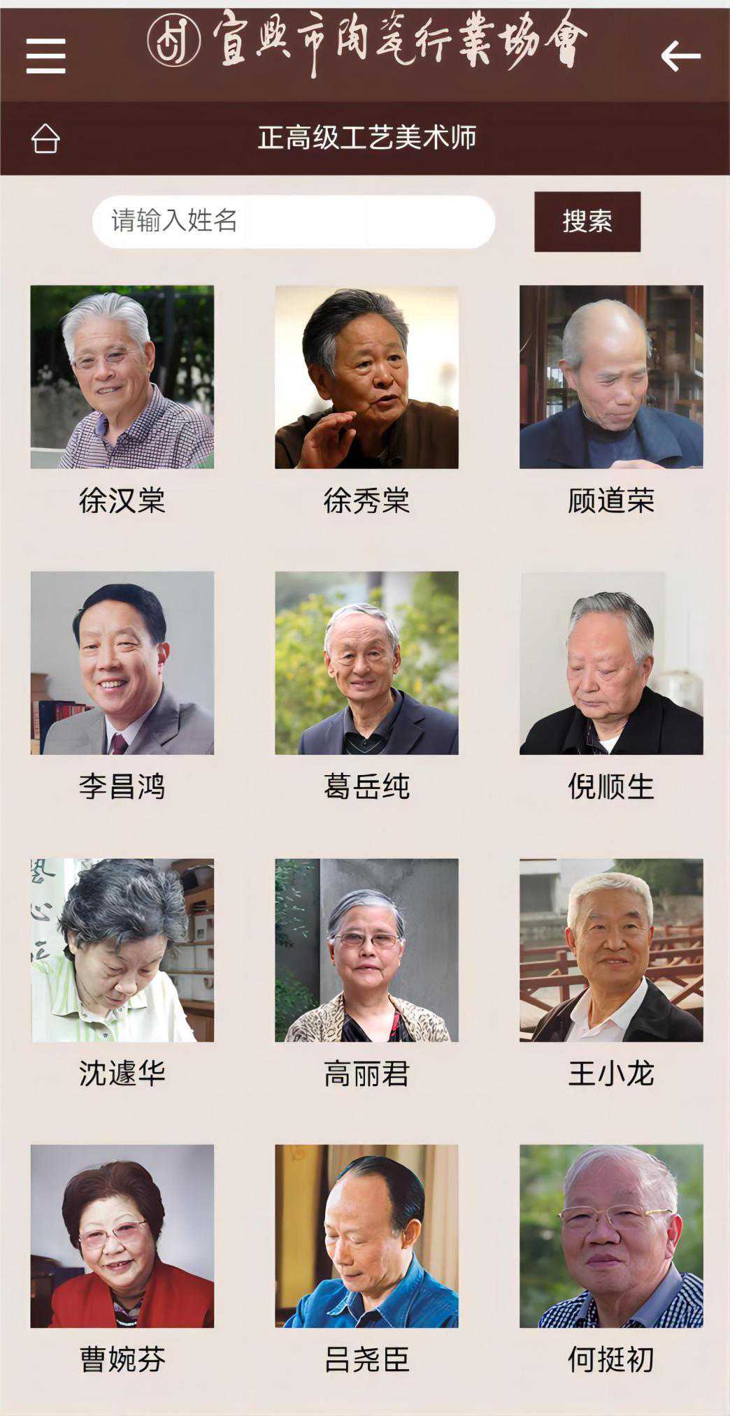 宜兴陶瓷行业协会微信小程序,在陶瓷人物中可以找到制作紫砂壶的国家级大师、正高级工艺美术师,此外还有省级大师、省名人,以及正高级乡村振兴技艺师、高级工艺美术师、高级乡村振兴技艺师、工艺美术师、乡村振兴技艺师、助力工艺美术师、助理乡村振兴技艺师、工艺美术员等。