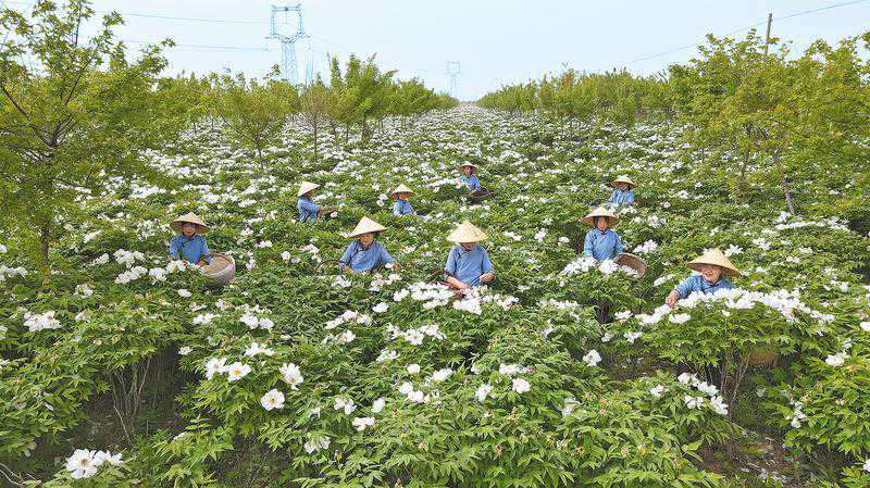 4、在合阳县坊镇万亩牡丹种植基地,村民忙着采摘牡丹花