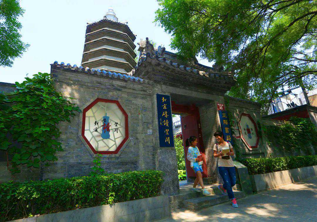 推开正阳书局小院的两扇木门,正对面就是这座万松老人塔。仰头望去,砖塔约有9层,每层都有重檐。最上面的尖型筒瓦顶上有刹座和宝珠。正午太阳下,这座砖灰色的塔,塔身散发着明亮的光芒。塔周围一圈被木栅包围,塔前两扇木门,上面写着“礼乐家声远,诗书世泽长”。