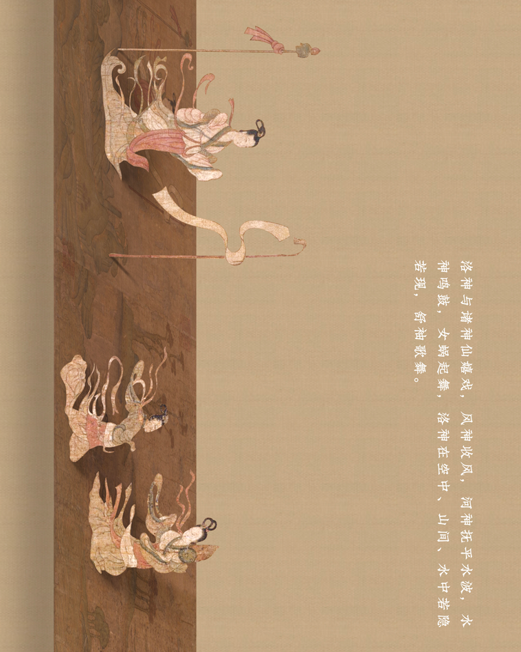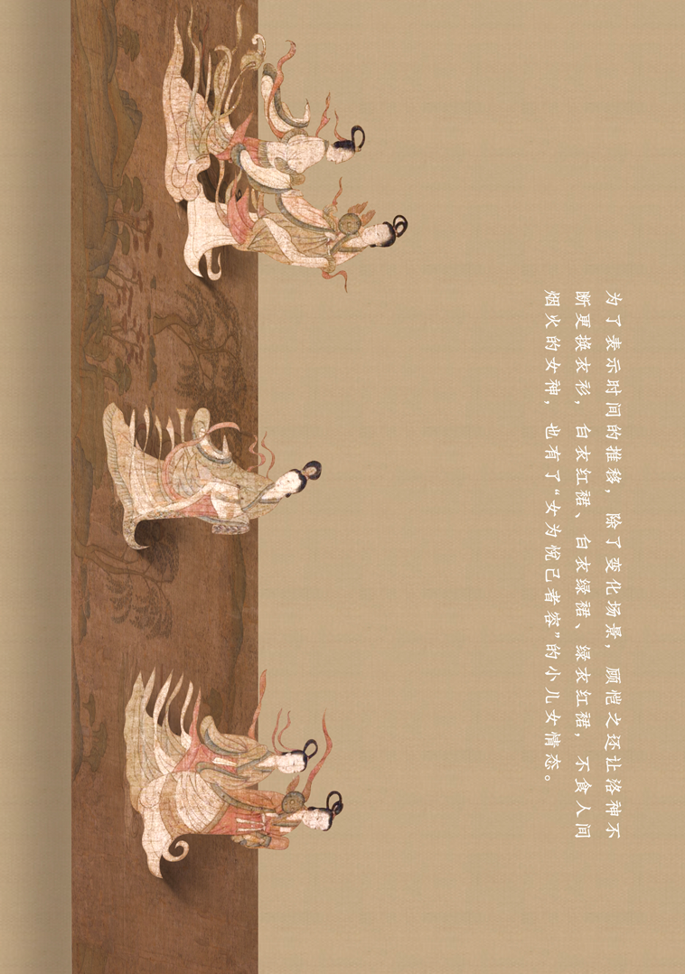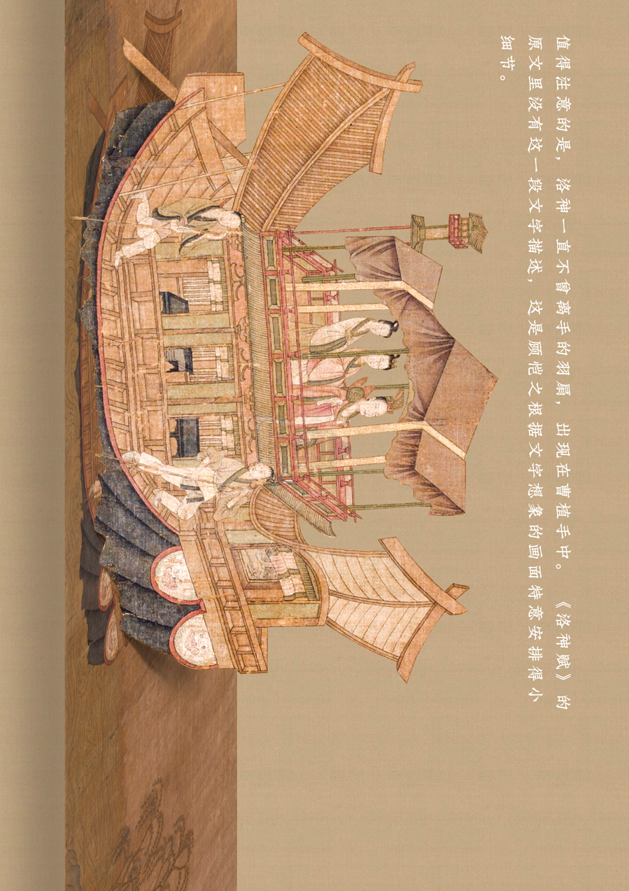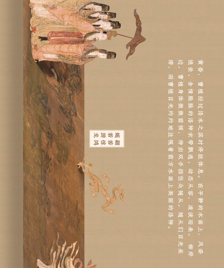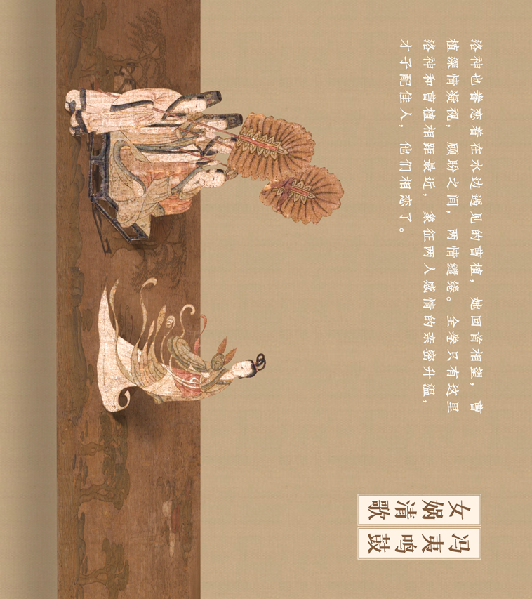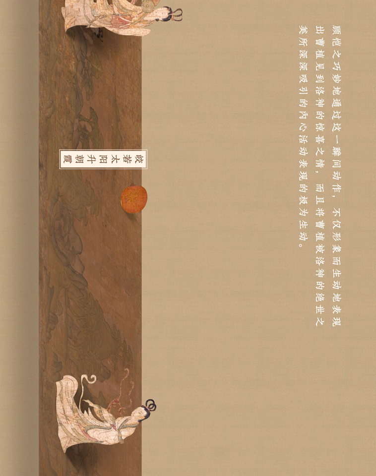这幅长卷曲折细致而又层次分明地描绘着曹植与洛神真挚的爱情故事。人物安排疏密得宜,在不同的时空中自然地交替、重叠、交换,而在山川景物描绘上,无不展现一种空间美。