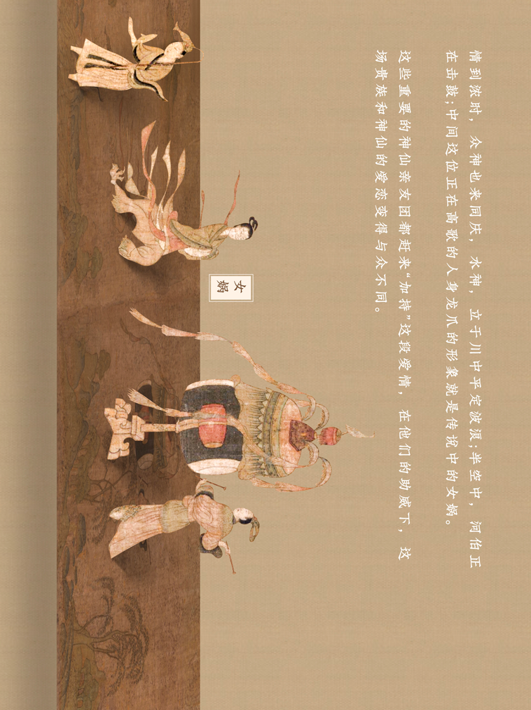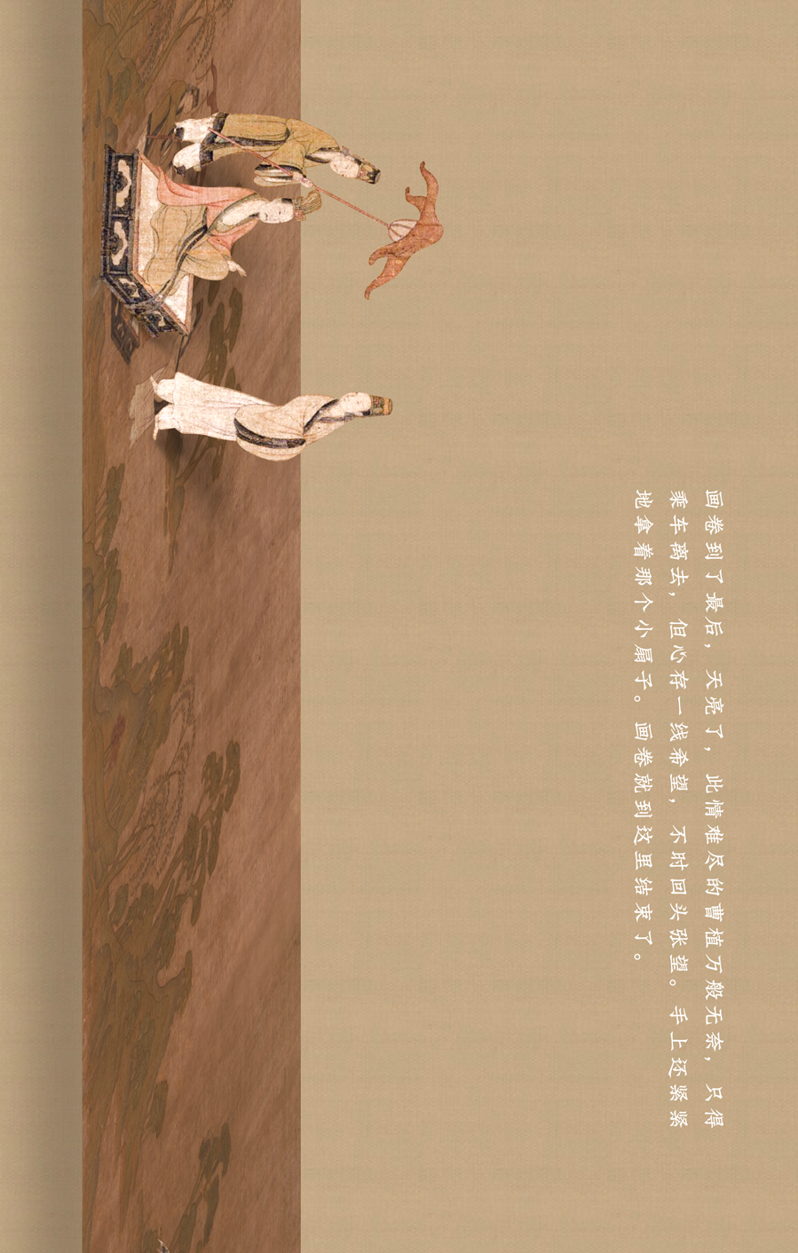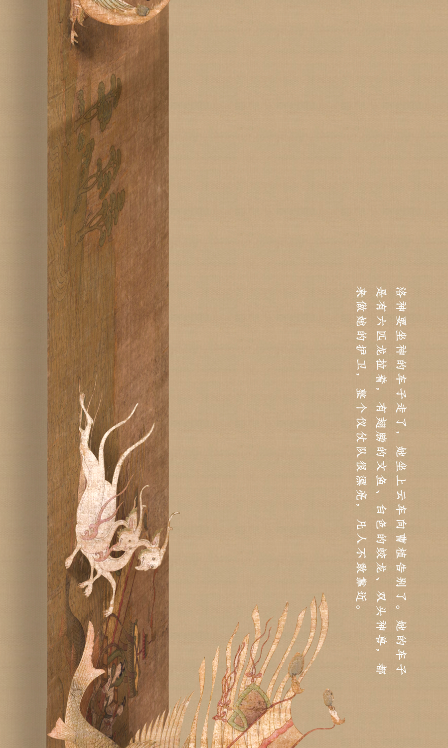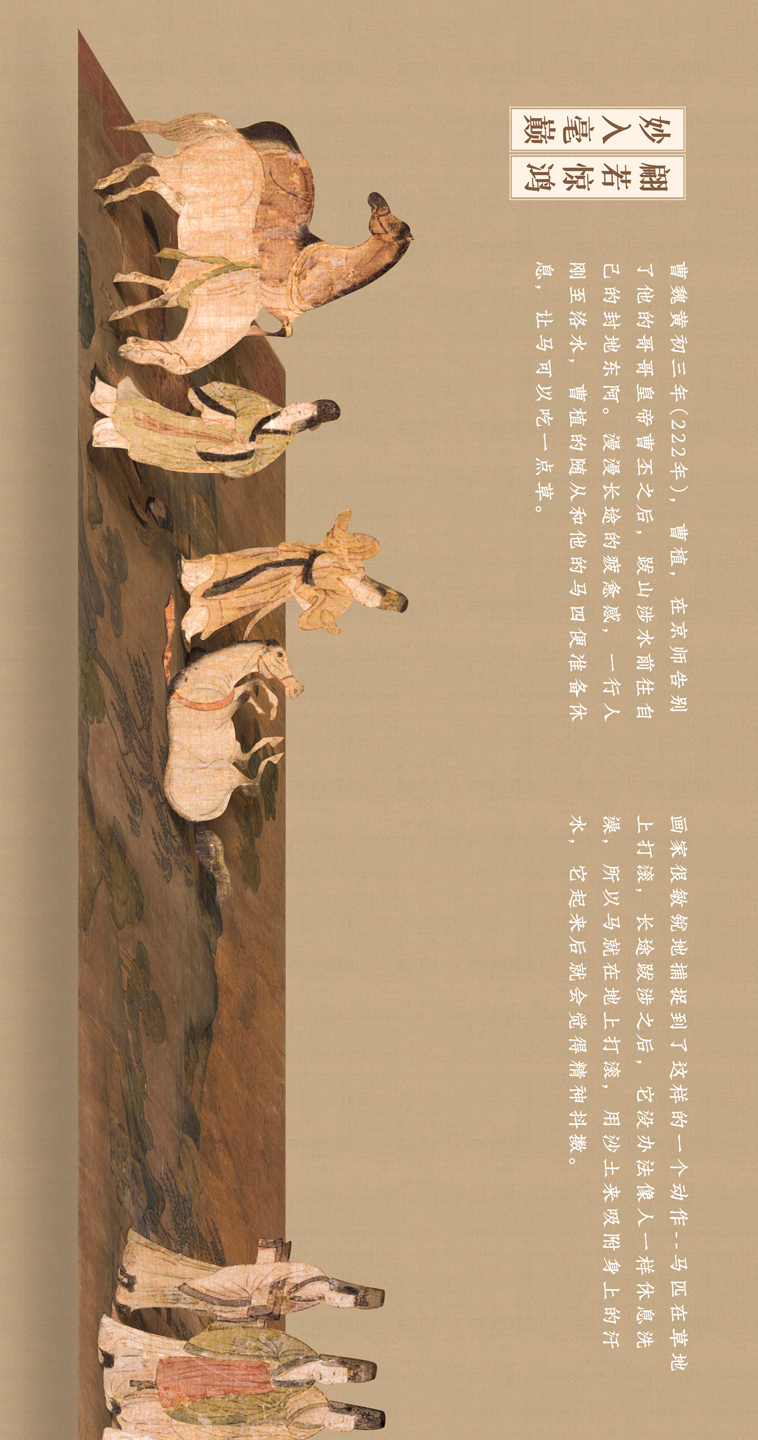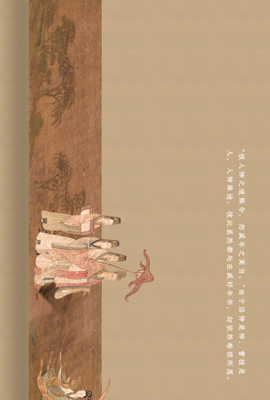 这幅长卷曲折细致而又层次分明地描绘着曹植与洛神真挚的爱情故事。人物安排疏密得宜,在不同的时空中自然地交替、重叠、交换,而在山川景物描绘上,无不展现一种空间美。