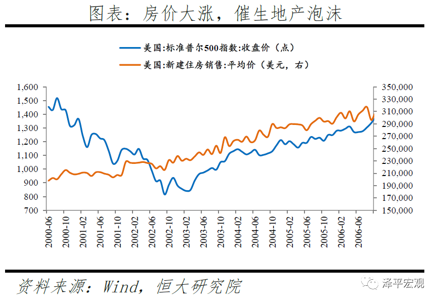 2001年互联网泡沫破灭叠加“911”事件冲击,美国经济陷入衰退,美联储宽松货币政策化解经济下行压力。1)2001-2003年美联储连续13次降息,联邦基金利率由2001年初的6.5%下调至2003年6月的1%。2)为提振经济,政府刺激购房,以次贷为首的衍生信用产品扩张失控,2001-2006年底,抵押贷款发放规模增加4070亿美元,达2.5万亿美元。