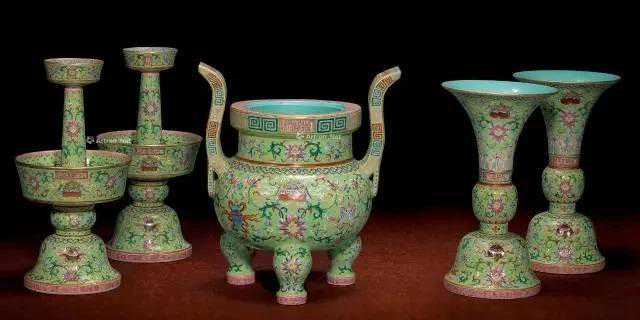 清道光浅绿地粉彩八宝纹五供(一套)尺寸:高38.3cm;38.2cm;40cm成交价:RMB3,680,000本五供为佛前供器,由一炉、二觚、二烛台组成。形制沿袭乾隆朝之式样,炉呈鼎式,盘口,朝冠耳,三柱足,鼓腹用于焚香;觚敞口束颈,喇叭形高足;烛台由蜡杆和承盘组成,形制敦厚凝重。五件器物釉色和纹饰基本一致,皆以浅绿釉为地,主体装饰粉彩缠枝西番莲八宝纹,构图繁密,色彩绚烂。五供的足墙外侧皆描绘粉色回纹一周,以示规整统一。香炉口沿、花觚颈部及烛台二层台外壁皆书“大清道光年制”篆书红款。本品与道光其它高级彩瓷一样,选取一种淡雅明快的色地为装饰基调,纹饰绘画精细,效果与乾隆者无异,整体彩釉搭配协调,妍丽而不炫目,柔和清雅,与道光皇帝追求彩瓷不得过艳的标准相符合。