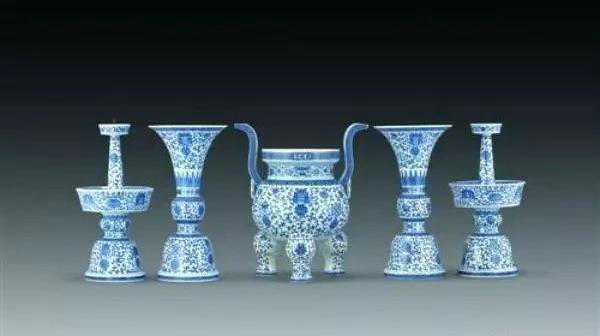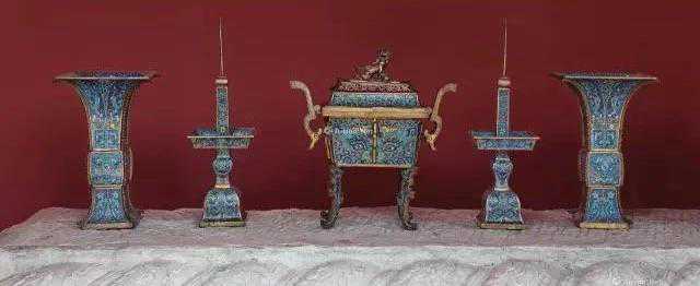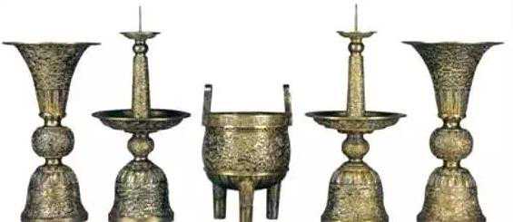 五供之事,佛道两家乃至神位供奉皆有。具体到器物,常见为一炉、两花瓶及两烛台,或者一炉、两花觚及两烛台,其功用一致:炉用来焚香、烛台用于燃烛,花瓶或花觚用来插花及吉祥供奉。五供材质甚多,既有金、银、铜、铁、锡,又有珐琅、陶瓷、玉石等。