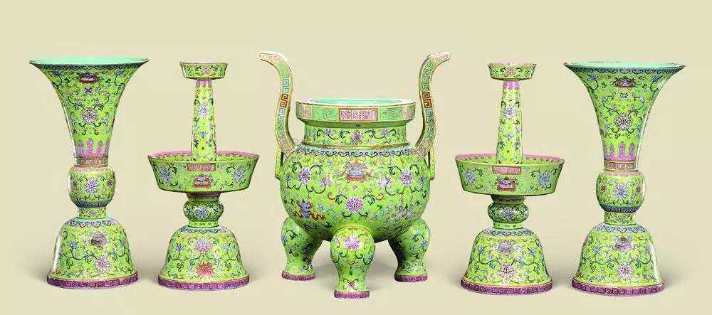 清嘉庆绿地粉彩缠枝莲托八吉祥纹(五供一套)尺寸:高29.7cm×5成交价:RMB2,531,160供养佛、菩萨的物品有六种:花、涂香、水、烧香、饭食、灯明,依次代表了布施、持戒、忍辱、精进、禅定、智慧等佛教“六度”。后来,供品演化为香、花、灯、水、果五种物品,是为“五供”:既表示对佛、菩萨的恭敬和礼拜,也象征着“六度”。受佛教影响,道教也有五供,“五供皆圆满,奉上众真前,志在求忏悔,亡者早生天。”在道教看来,五供各有真意。