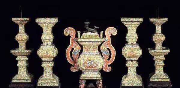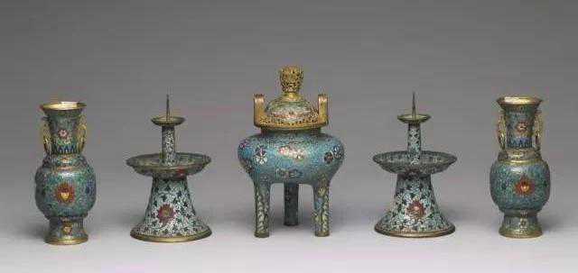 晚明掐丝珐琅五供尺寸:烛台高47cm;香炉高32.5cm;花觚高34.5cm成交价:RMB2,990,000“身是香炉,心是香子,香烟一性分明是。依时焚爇透昆仑,缘空香袅透祥瑞。上彻云霄,高分真异,成雯作盖包玄旨。金花院里得逍遥,玉皇几畔常参侍。”(明•王重阳《咏烧香》)香:可上达于三境十天,下彻于九幽五道。花:能舞动阳气,熏沐金容,花光灿烂,照映十方。灯:能灼透幽冥,照开泉路。水:能涤炼阴魂,恢复真形。果:象征着可结果而收,早登仙界。