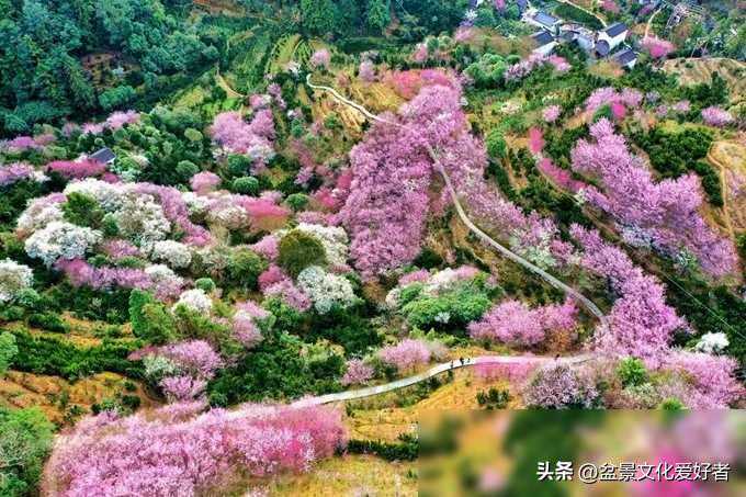 一条整洁的山路蜿蜒通向村庄,两旁是盛开的梅花,行人在其中穿行,犹如置身花海,眼睛被各种颜色所吸引。
