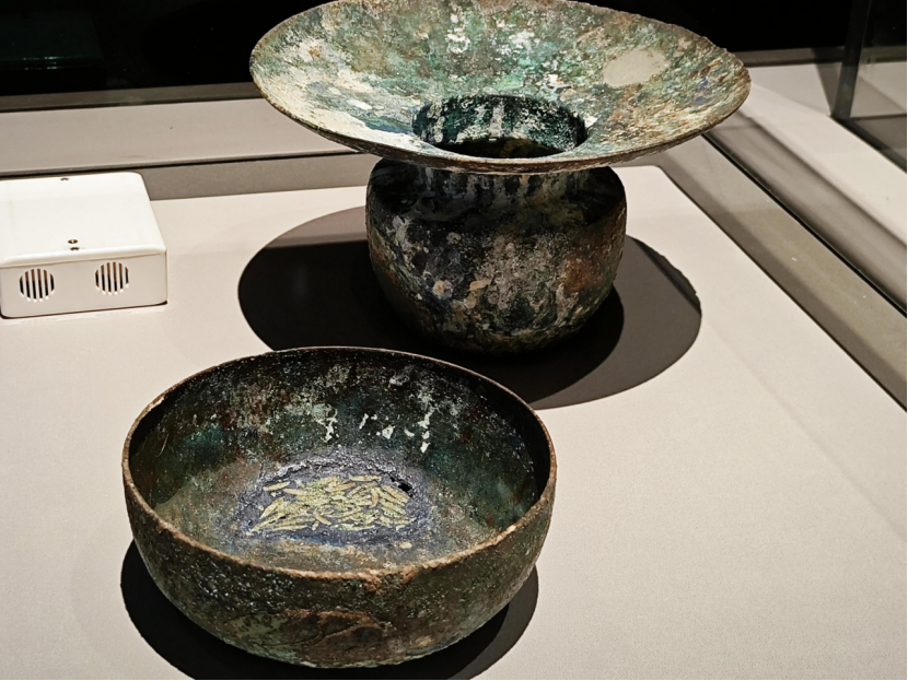 宜兴窑紫砂凸花纹诗文盖罐(左上)、银提梁方火壶(右上)、雍正款斗彩团菊纹盖罐(左下)、金爵(右下)