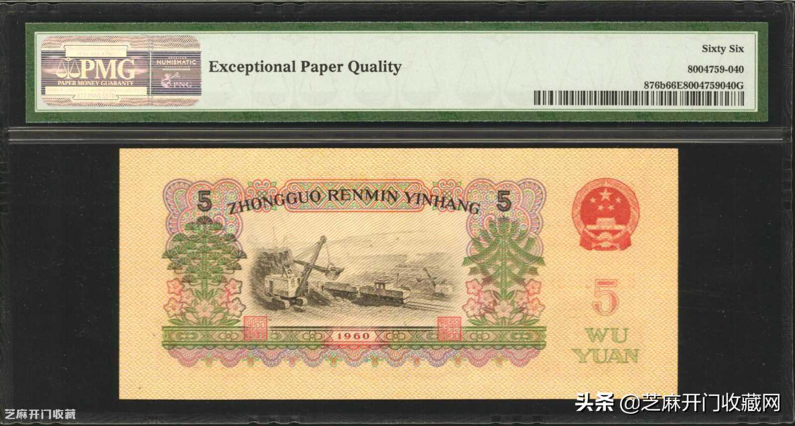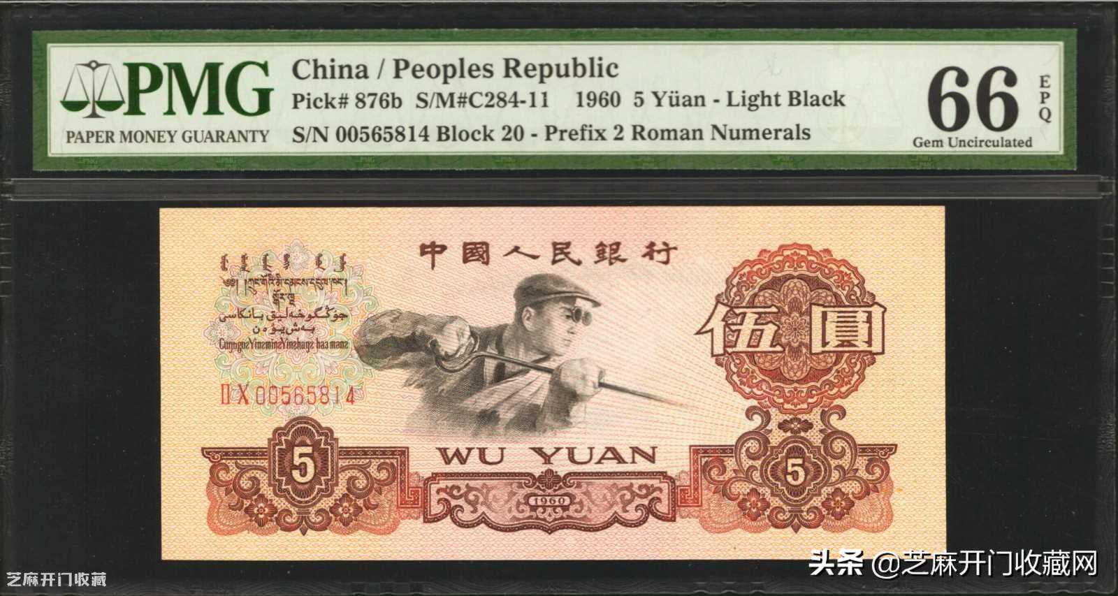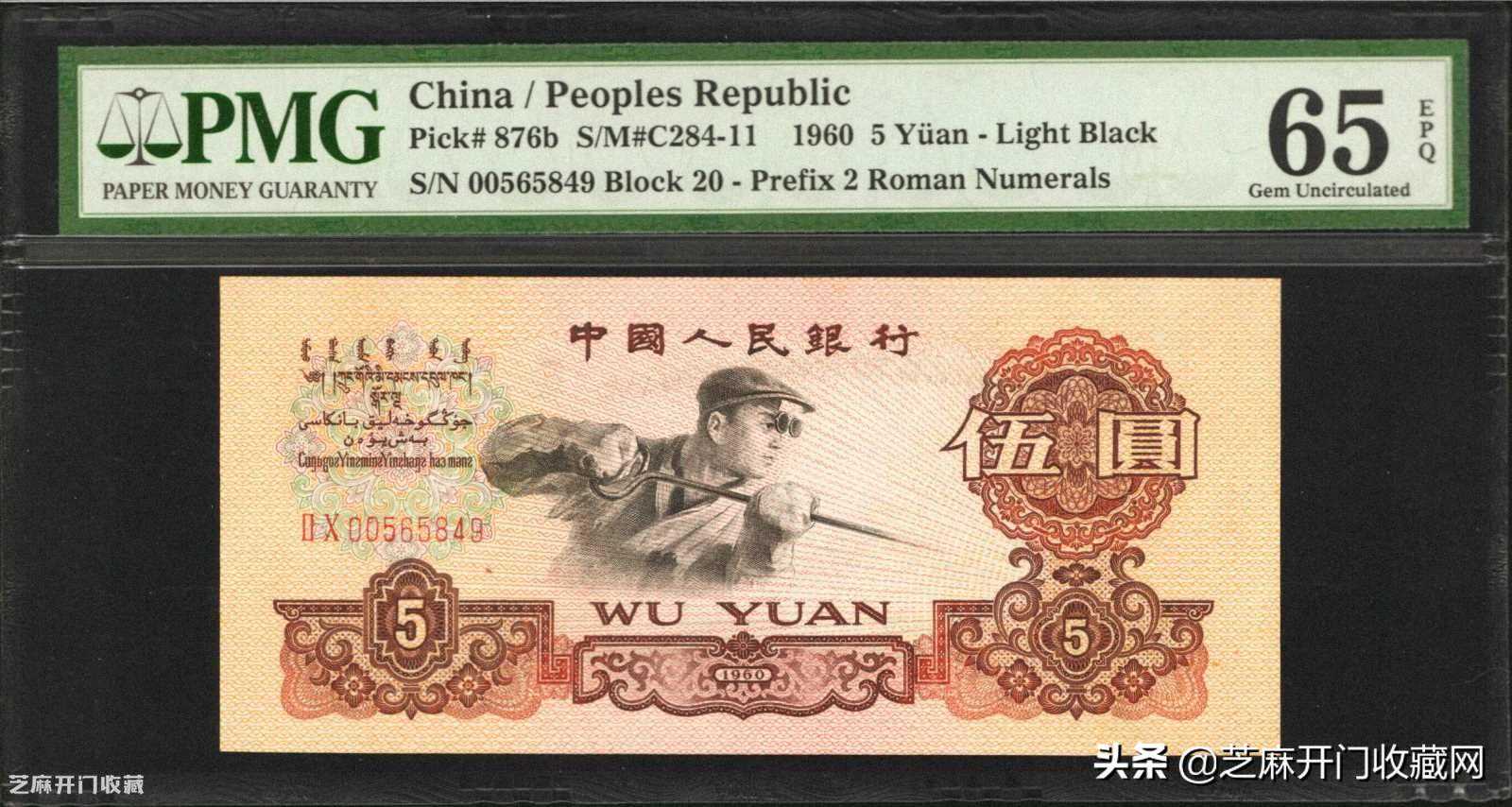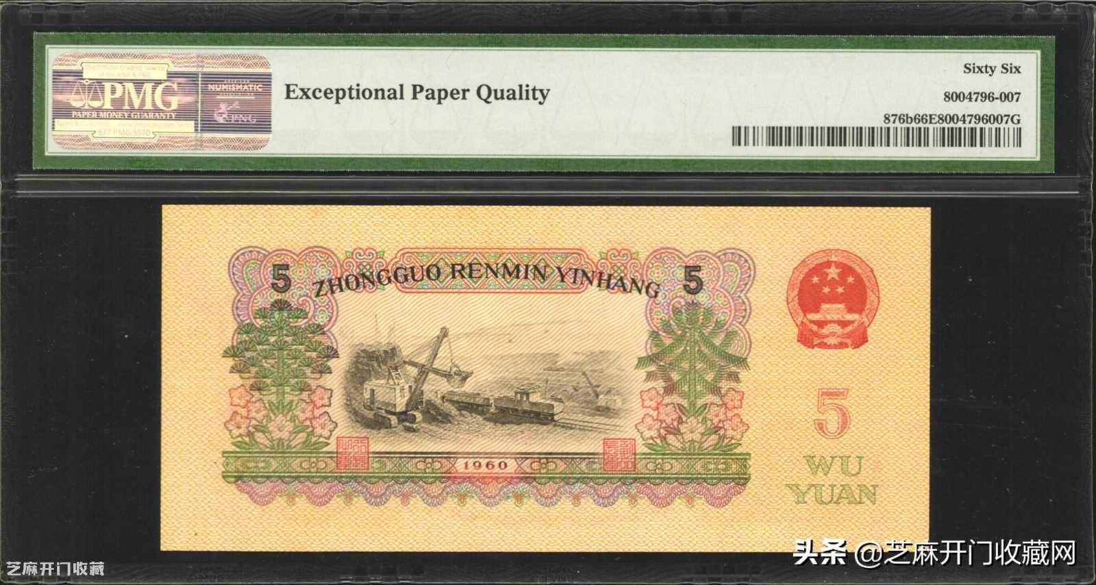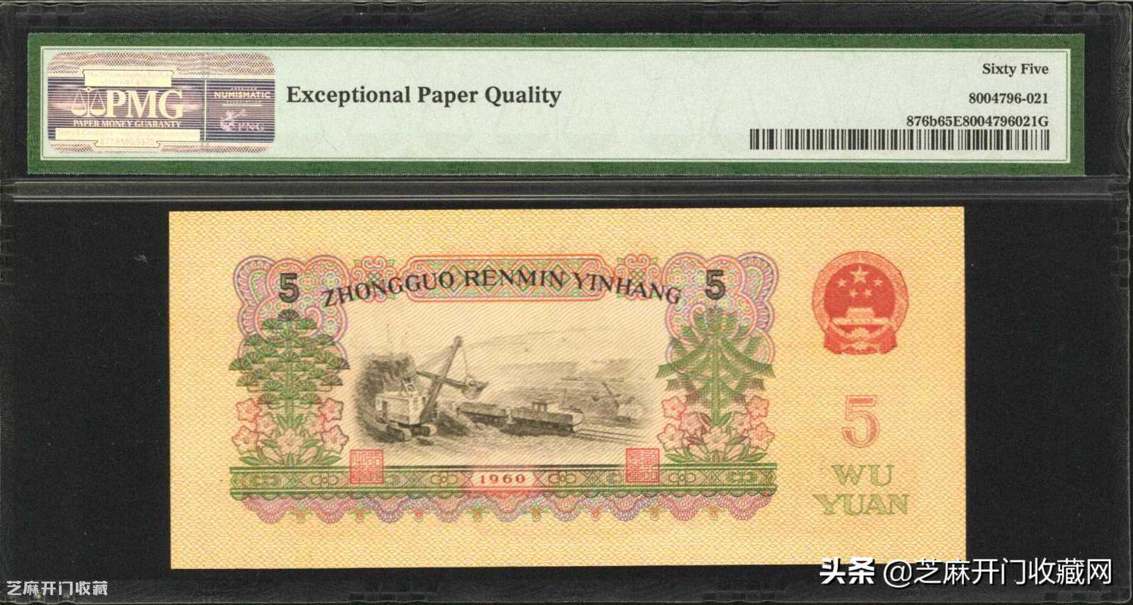 2:1960年第三版人民币伍圆。PMG65EPQ.,估价:USD600-1000,成交价格:USD432
