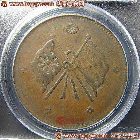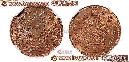 1,928年陕西省造双旗背嘉禾二分铜币一枚,PCGSMS63BN