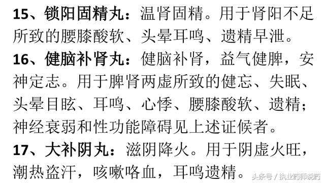 14、五子衍宗丸:补肾益精。用于肾虚精亏所致的阳痿不育、遗精早泄、腰痛、尿后余沥。