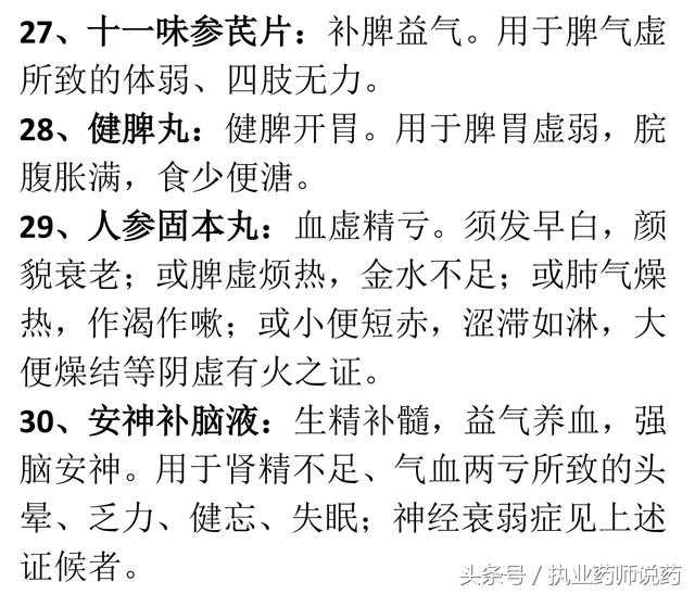 31、柏子养心丸:补气,养血,安神。用于心气虚寒,心悸易惊,失眠多梦,健忘。