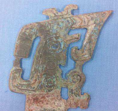 “爰”字纹戈内的后半部为镂空钩喙歧冠的鸟形。《诗•商颂•玄鸟》中说:“天命玄鸟,降而生商。”《史记•殷本纪》中记载:“殷契,母曰简狄,有娀氏之女,为帝喾次妃。三人行浴,见玄鸟堕其卵,简狄取吞之,因孕生契。”这两条资料证明商人认玄鸟为自己的始祖。青铜器上的鸟纹或因此而来。“爰”戈鸟纹冠喙大、身尾短,一面鸟身饰云纹,一面鸟身上有一阳文“爰”字。该墓有“爰”字的同铜器除了铜戈外还有鼎、罍、斝、簋、觚、爵等,发掘者认为“爰”是基主之名或墓主所属的族徽。