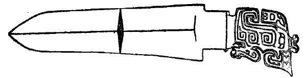青铜戈根据内的形状可分为直内、曲内和銎内三大类,“爰”字纹戈属曲内戈。“爰”字纹戈器形较为独特,从锋部来说,商代主要的戈锋主要有圆舌形锋、尖舌形锋和圭首形锋等几种形式。“爰”字纹戈的锋迥异于这几种流行的戈锋,戈锋上刃为平滑曲线,下刃为直线,具备了圭首形锋的部分特征。