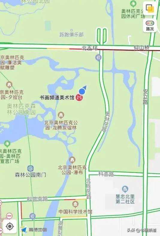 地铁八号线森林公园南门B口出,进入奥林匹克森林公园南门,右拐沿红色跑道或路标找到“中央数字电视书画频道”或“森林艺术中心”(步行15-20分钟)。