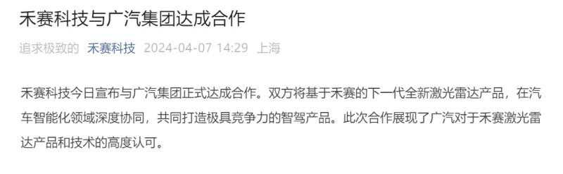 易车讯4月7日,禾赛科技宣布与广汽集团正式达成合作。双方将基于禾赛的下一代全新激光雷达产品,在汽车智能化领域深度协同,共同打造极具竞争力的智驾产品。