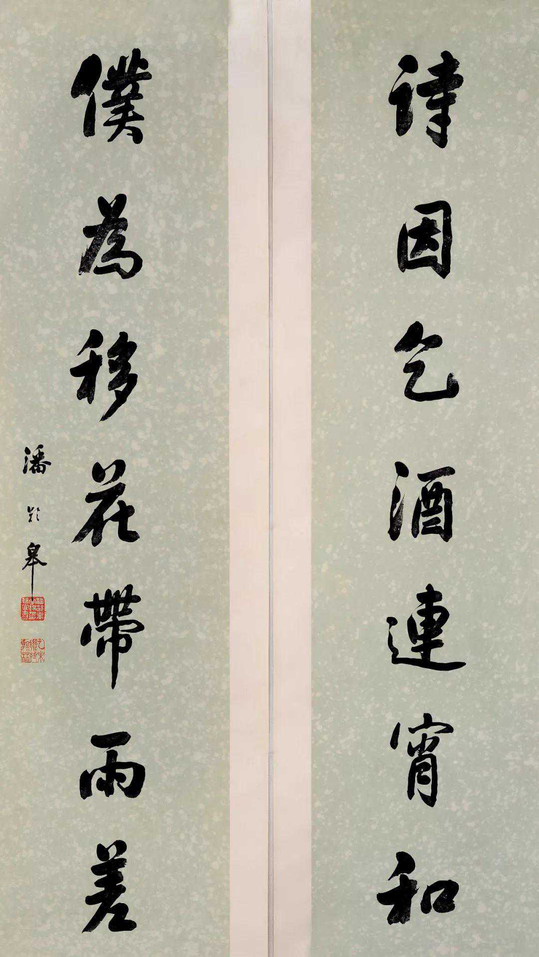 释文:羔雁礼将行传闻烛下调红粉,摽梅诗有赠明镜台前作好春。金铭仁兄世先生重调锦瑟纳吉戒期以长联索书,为集孟浩然徐安期诗句,籍兹吉语敬祝,休嘉即晞。哂正,癸酉上元前二日。竺楼祝书元并识于浥江寓庐。