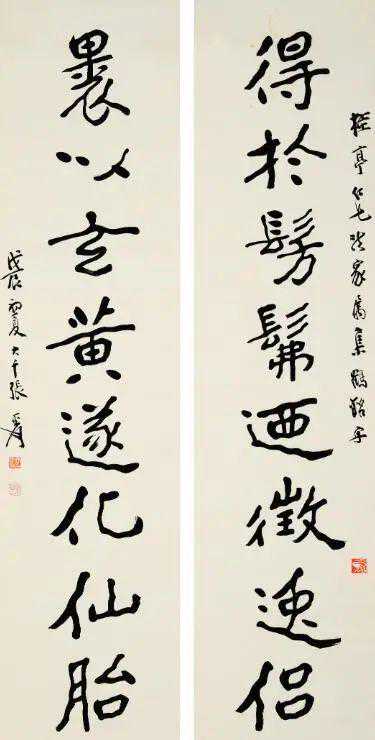 释文:得于仿佛乃征逸侣,裹以玄黄遂化仙胎。桂亭仁兄法家属,集《鹤铭》字。戊辰初夏,大千张爰。