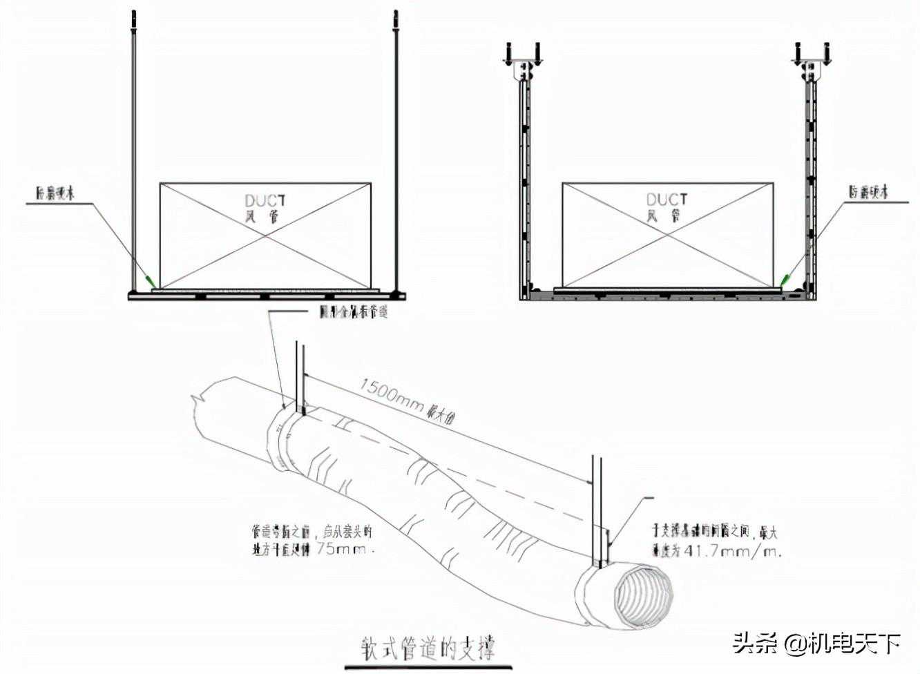 (6)吊杆圆钢应根据风管安装标高适当截取。套丝不宜过长,丝扣末端不宜超出托架最低点,不应妨碍装饰吊顶的施工。