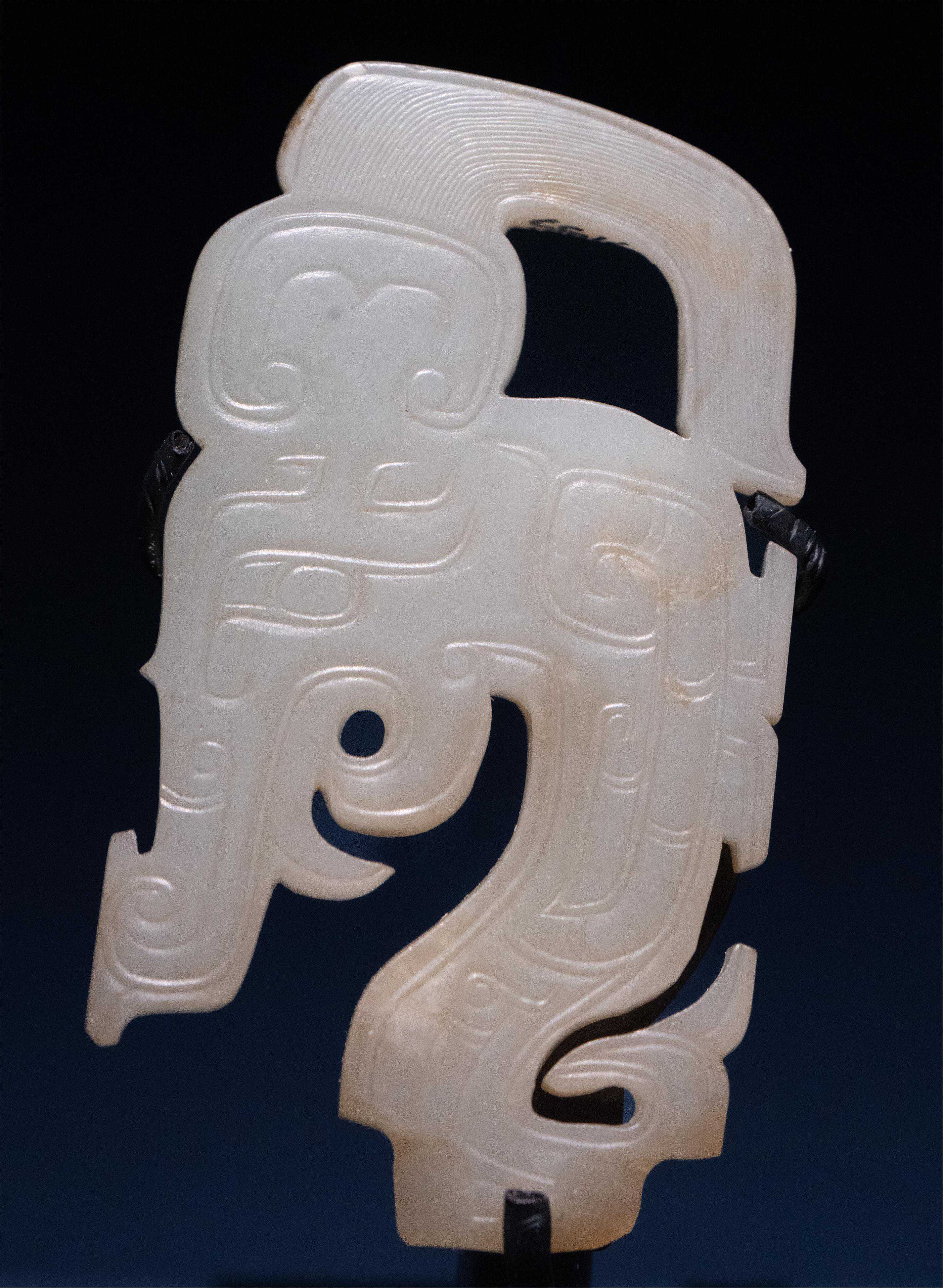 凤龙纹玉饰构图呈“下龙上凤”的形式,凤鸟“羽冠勾喙、翅翼高卷”,为西周中晚期的流行图案,这是西周玉器出现的一种特有的人兽复合纹样,其他时代少见,与“凤鸣岐山”的周始祖肇兴传说有关,蕴有吉祥的寓意。