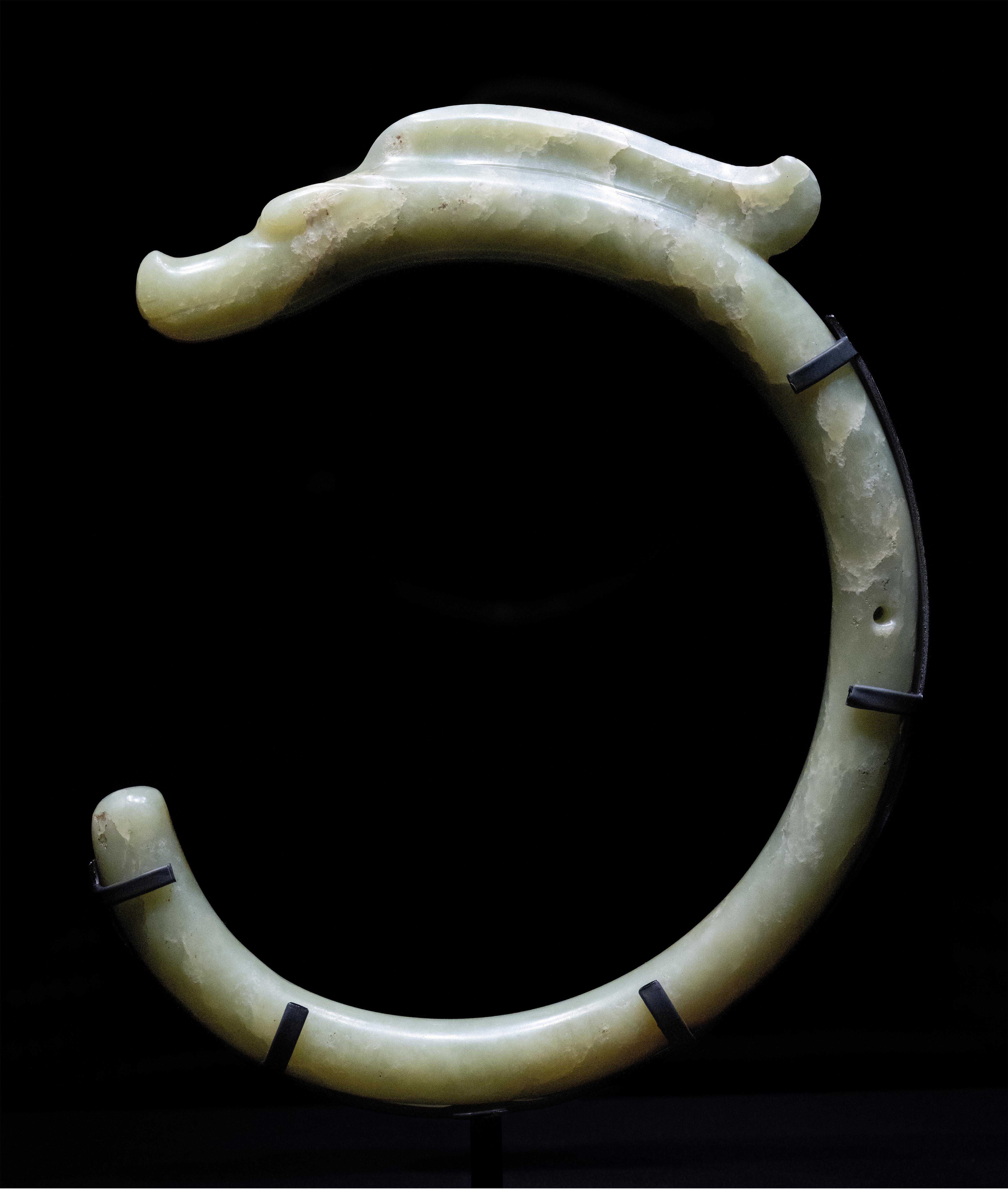 龙首形似兽,耳贴于颈部,上唇厚大,下唇尖细,嘴部镂空且刻有齿纹。璜身多饰以弧线勾连而成的龙身。