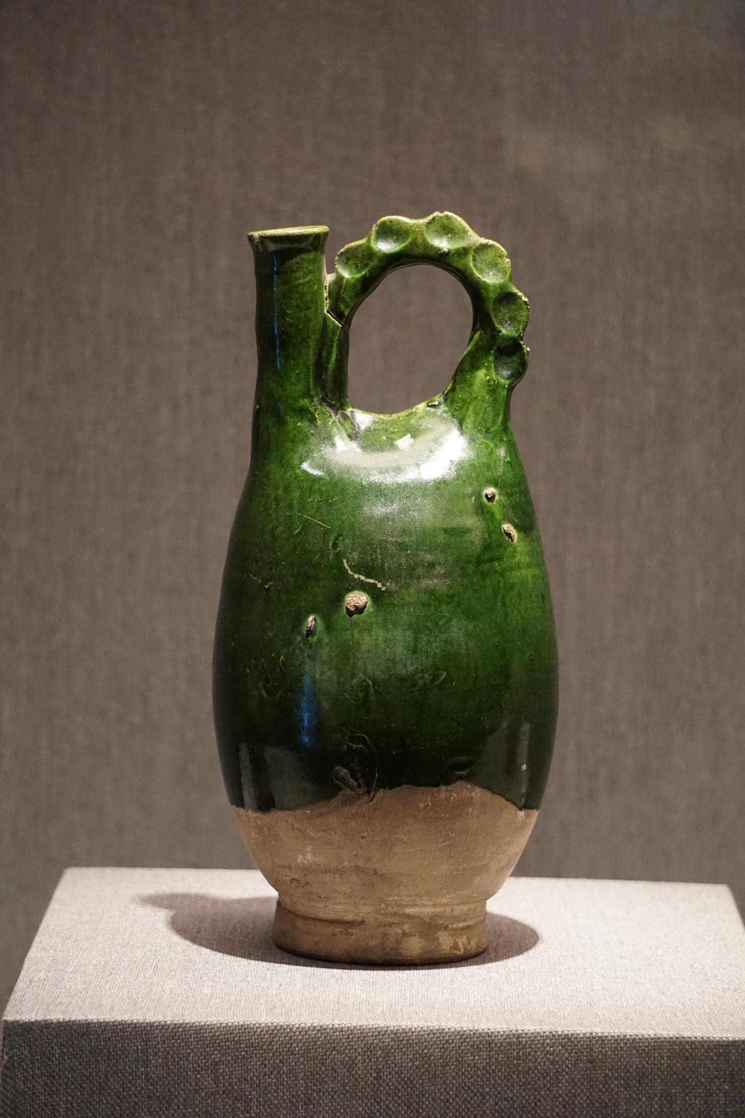 白釉绿彩皮扣装饰单孔鸡冠壶辽
