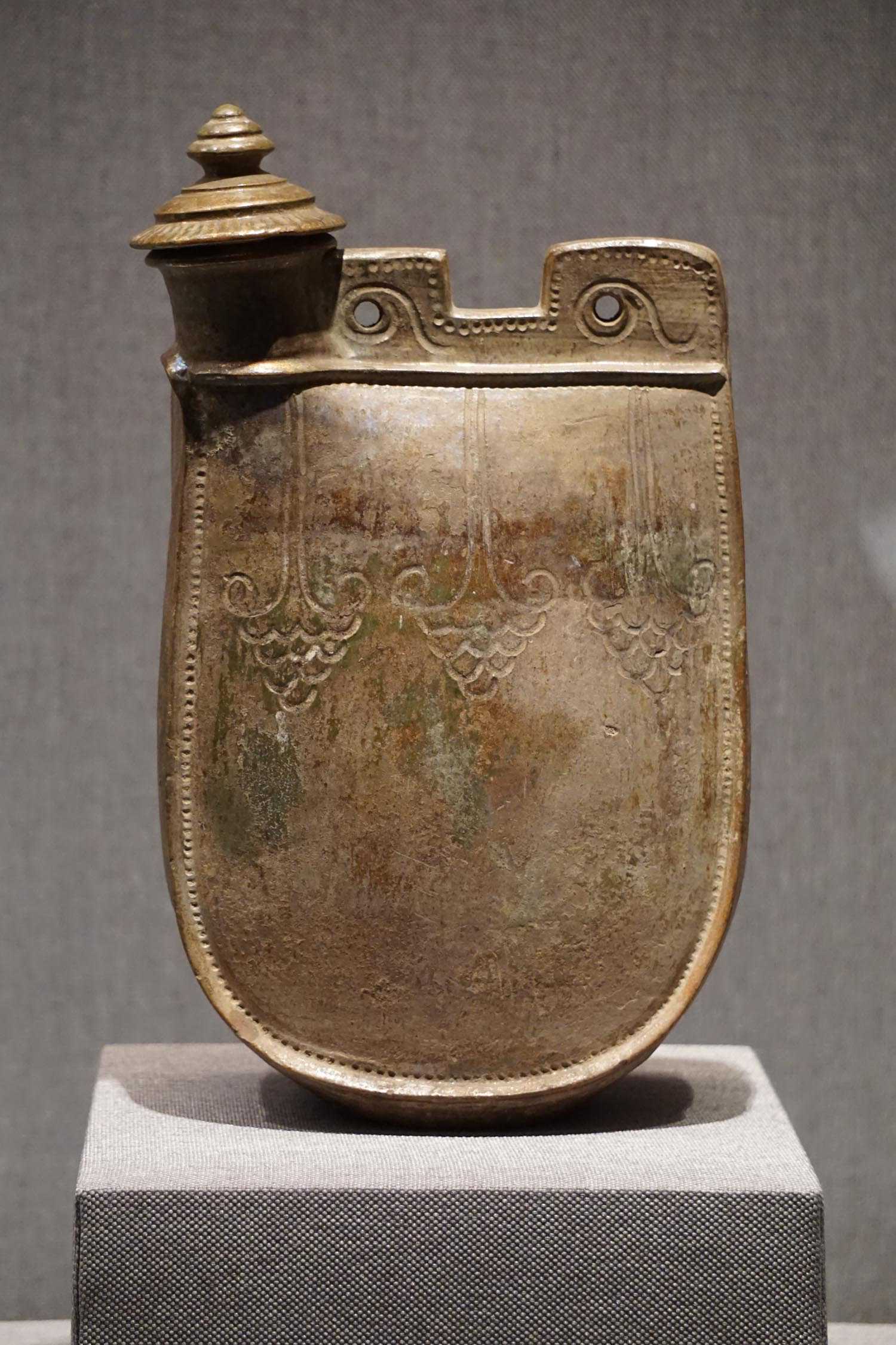 鳝鱼黄釉雕几何纹穿带扁壶辽
