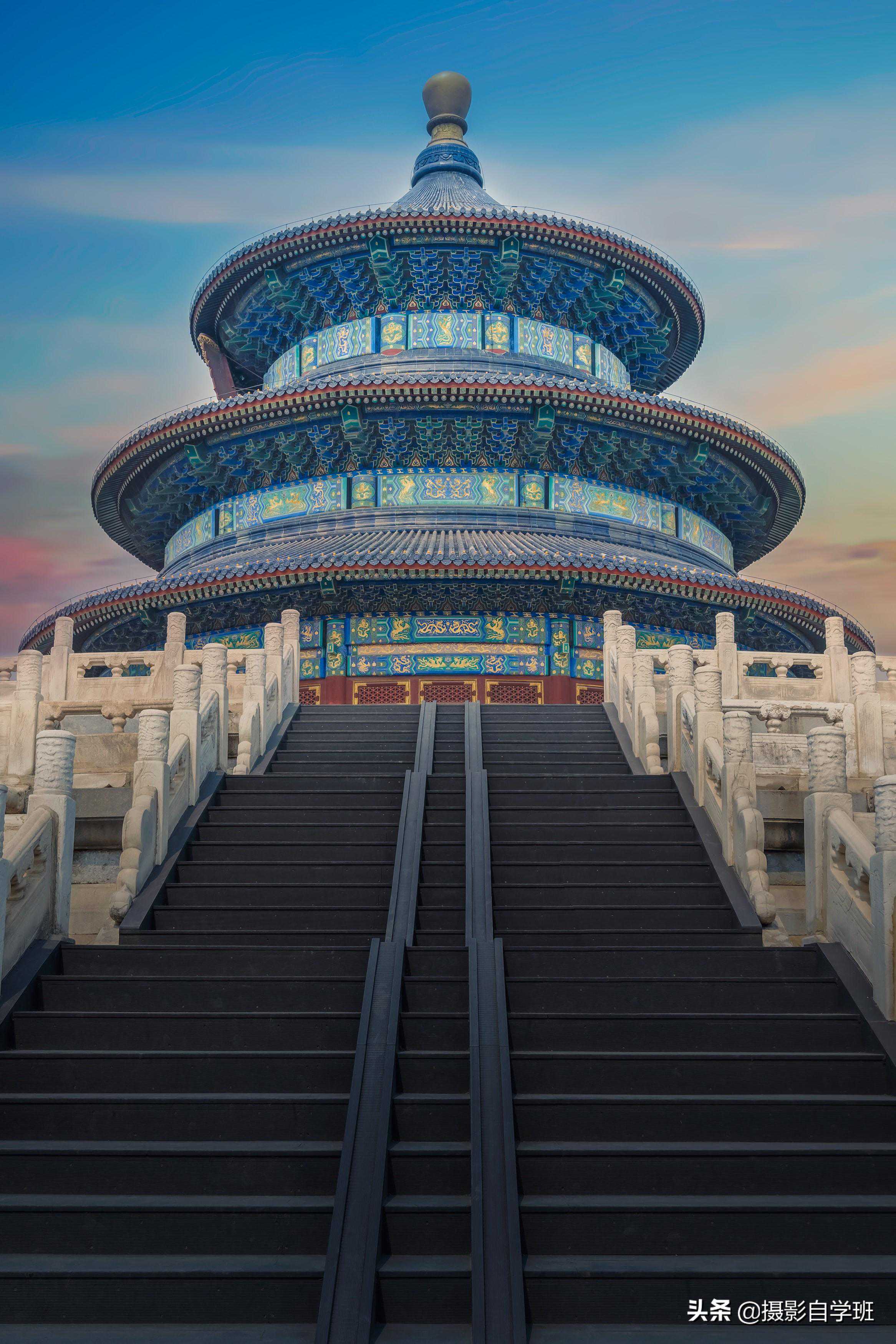 改变角度:同样是拍天坛,让天坛头顶照片上边缘,脚踏照片下边,照片就会显得非常拥挤,很有气势的建筑,也拍的普通平常的。而我们走到台阶下方,顺着台阶向上拍,通过台阶纵身向上的线形成引导。就可以很好的拍出天坛的气势。无论横屏还是竖屏,都可以得到相对不一般的古建筑照片。