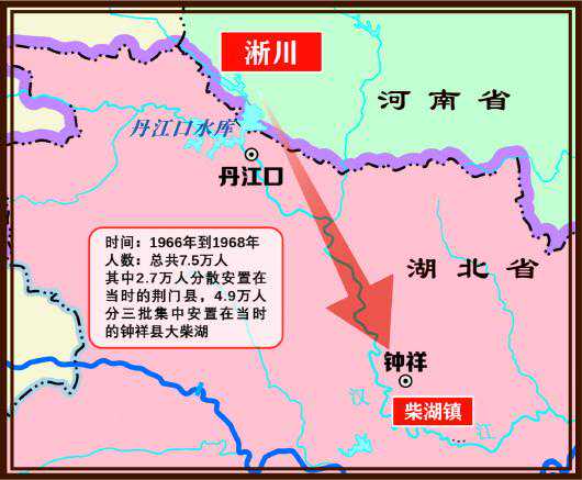 1967年丹江口大坝下闸蓄水。淅川县是丹江口水库重点淹没区。从1966年到1968年,河南、湖北两省共搬迁38万人,淅川县的移民占了20万人。迁往湖北的淅川移民有7.5万,其中,2.6万人分散安置在当时的荆门县,4.9万人集中安置在当时的钟祥县大柴湖。