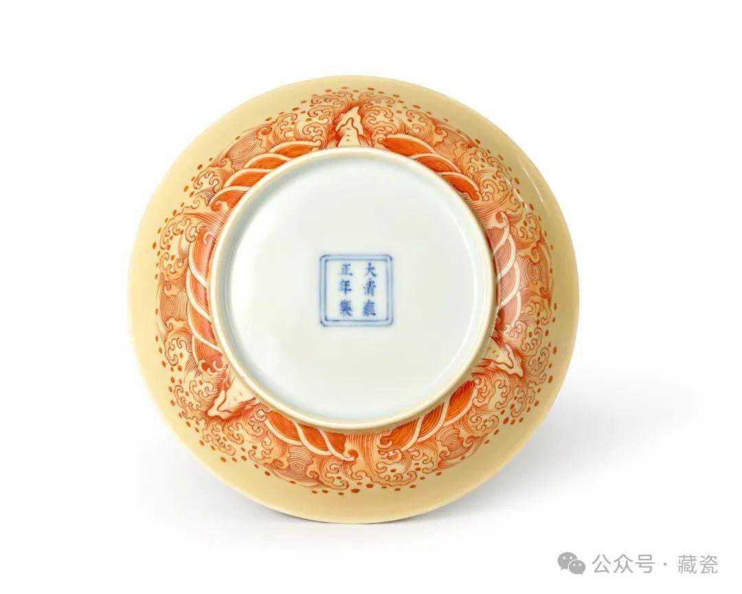 Lot3628清雍正米黄地矾红彩云龙纹盘